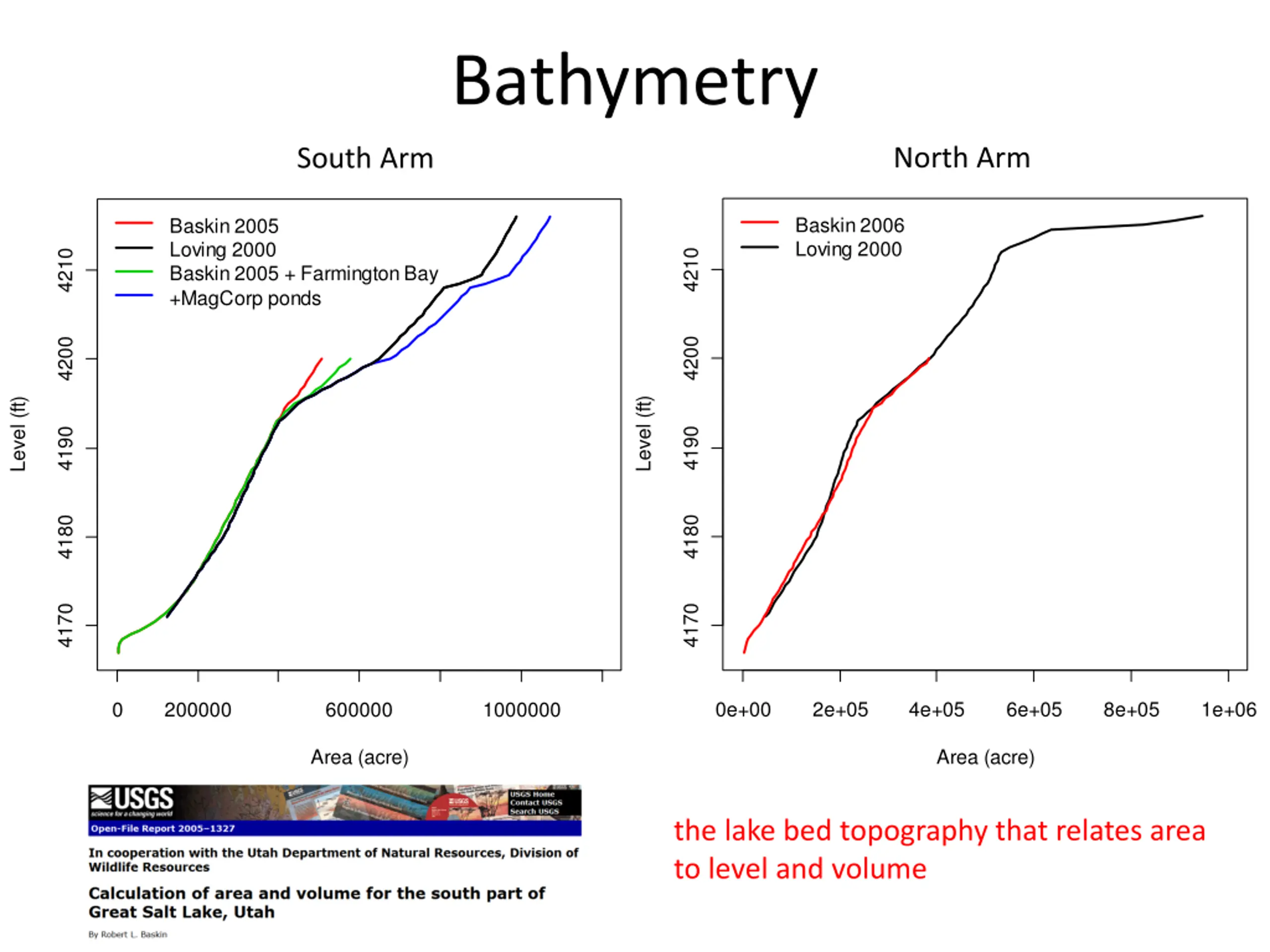 Bathymetry North Arm South Arm Baskin 2006 Loving 2000 Baskin 2005 Loving 2000 Baskin 2005 + Farmington Bay +MagCorp ponds 4210 4210 4200 4200 Level (ft) Level (ft) 4190 4190 4180 4180 4170 4170 0e+00 2e+05 4e+05 6e+05 8e+05 1e+06 0 200000 600000 1000000 Area (acre) Area (acre) the lake bed topography that relates area to level and volume