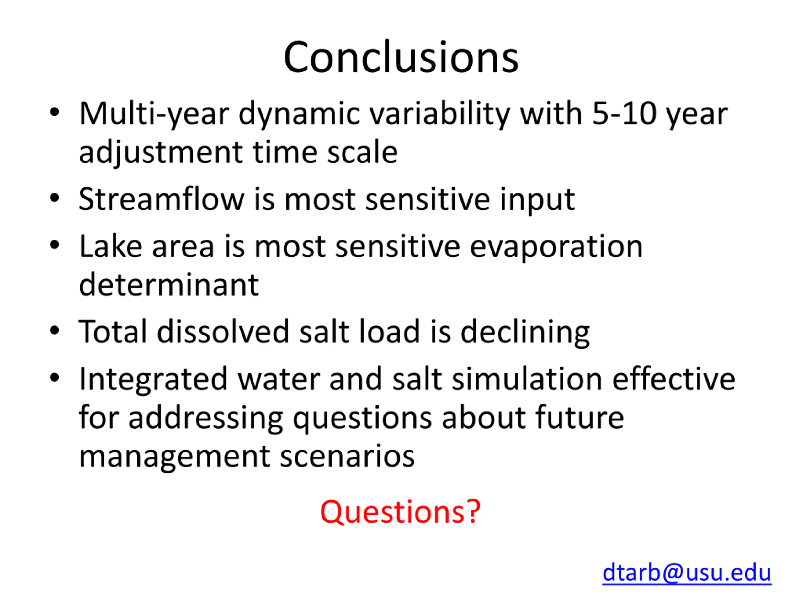 Conclusions Multi-year dynamic variability with 5-10 year adjustment time scale Streamflow is most sensitive input Lake area is most sensitive evaporation determinant Total dissolved salt load is declining Integrated water and salt simulation effective for addressing questions about future management scenarios Questions? dtarb@usu.edu
