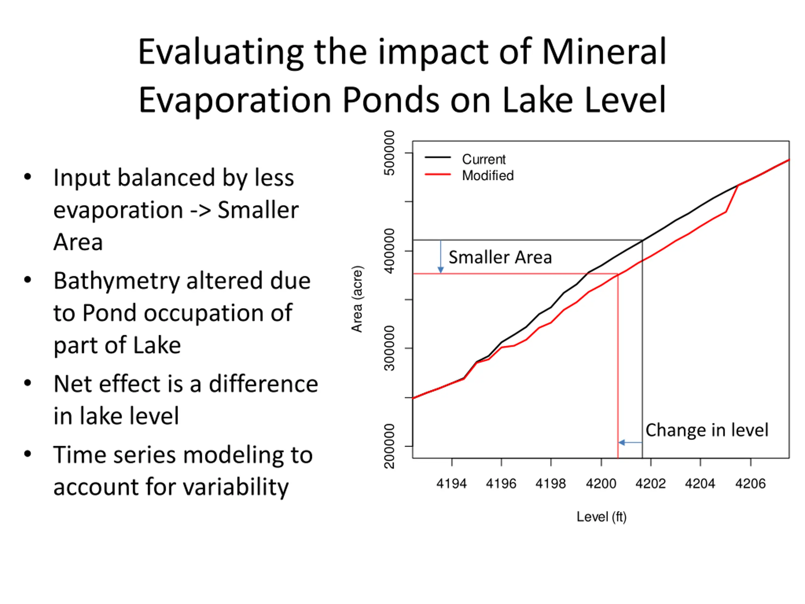 Evaluating the impact of Mineral Evaporation Ponds on Lake Level 500000 Current Modified Input balanced by less evaporation -> Smaller Area Bathymetry altered due to Pond occupation of part of Lake Net effect is a difference in lake level Time series modeling to account for variability 400000 Smaller Area Area (acre) 300000 Change in level 200000 4194 4196 4198 4200 4202 4204 4206 Level (ft)