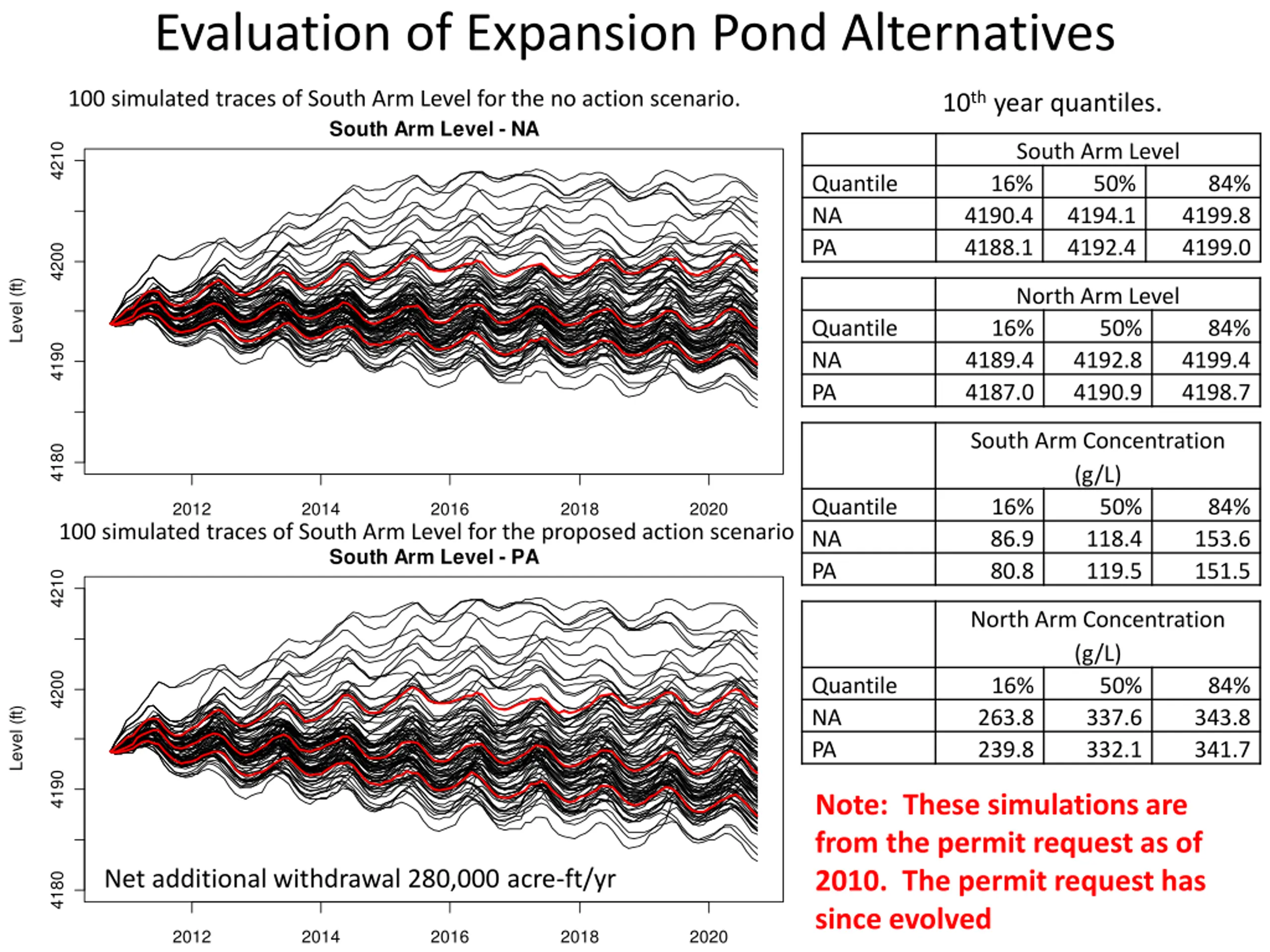 Evaluation of Expansion Pond Alternatives 100 simulated traces of South Arm Level for the no action scenario. 10th year quantiles. South Arm Level - NA South Arm Level 16% 4190.4 4194.1 4188.1 4192.4 4210 Quantile NA PA 50% 84% 4199.8 4199.0 4200 Level (ft) North Arm Level 16% 4189.4 4187.0 Quantile NA PA 50% 84% 4190 4192.8 4190.9 4199.4 4198.7 South Arm Concentration (g/L) 16% 50% 86.9 118.4 80.8 119.5 4180 Quantile NA PA 84% 153.6 151.5 2012 2014 2016 2018 2020 100 simulated traces of South Arm Level for the proposed action scenario South Arm Level - PA 4210 North Arm Concentration (g/L) 16% 50% 263.8 337.6 239.8 332.1 4200 Quantile NA PA 84% 343.8 341.7 Level (ft) 4190 Note: These simulations are from the permit request as of 2010. The permit request has since evolved Net additional withdrawal 280,000 acre-ft/yr 4180 2012 2014 2016 2018 2020