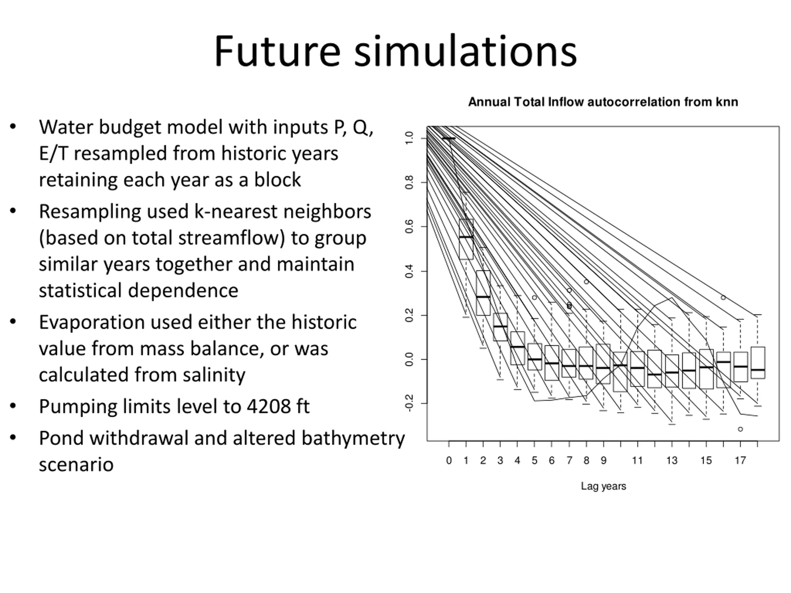 Future simulations Annual Total Inflow autocorrelation from knn Water budget model with inputs P, Q, E/T resampled from historic years retaining each year as a block Resampling used k-nearest neighbors (based on total streamflow) to group similar years together and maintain statistical dependence Evaporation used either the historic value from mass balance, or was calculated from salinity Pumping limits level to 4208 ft Pond withdrawal and altered bathymetry scenario 1.0 0.8 0.6 0.4 0.2 0.0 -0.2 0 1 2 3 4 5 6 7 8 9 11 13 15 17 Lag years