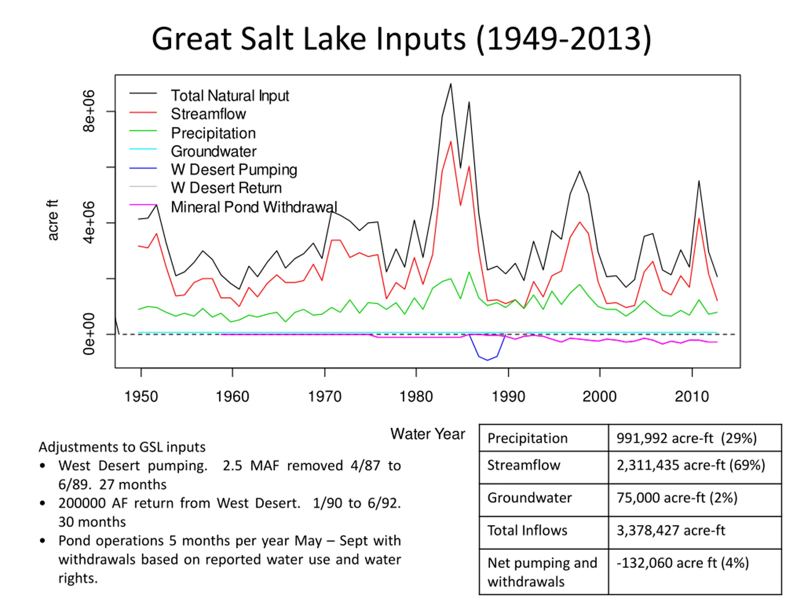 Great Salt Lake Inputs (1949-2013) Total Natural Input Streamflow Precipitation Groundwater W Desert Pumping W Desert Return Mineral Pond Withdrawal 8e+06 acre ft 4e+06 0e+00 1950 1960 1970 1980 1990 2000 2010 Water Year Precipitation 991,992 acre-ft (29%) Adjustments to GSL inputs West Desert pumping. 2.5 MAF removed 4/87 to 6/89. 27 months 200000 AF return from West Desert. 1/90 to 6/92. 30 months Pond operations 5 months per year May Sept with withdrawals based on reported water use and water rights. Streamflow 2,311,435 acre-ft (69%) Groundwater 75,000 acre-ft (2%) Total Inflows 3,378,427 acre-ft Net pumping and withdrawals -132,060 acre ft (4%)