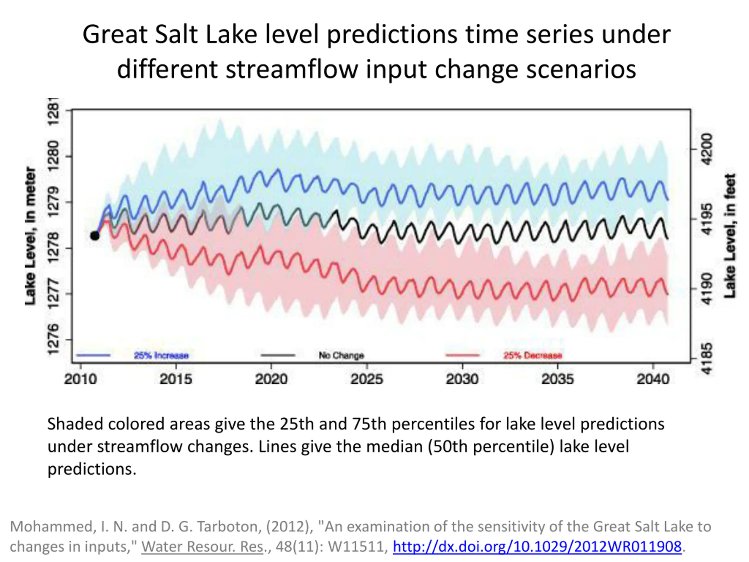 Great Salt Lake level predictions time series under different streamflow input change scenarios Shaded colored areas give the 25th and 75th percentiles for lake level predictions under streamflow changes. Lines give the median (50th percentile) lake level predictions. Mohammed, I. N. and D. G. Tarboton, (2012), "An examination of the sensitivity of the Great Salt Lake to changes in inputs," Water Resour. Res., 48(11): W11511, http://dx.doi.org/10.1029/2012WR011908.