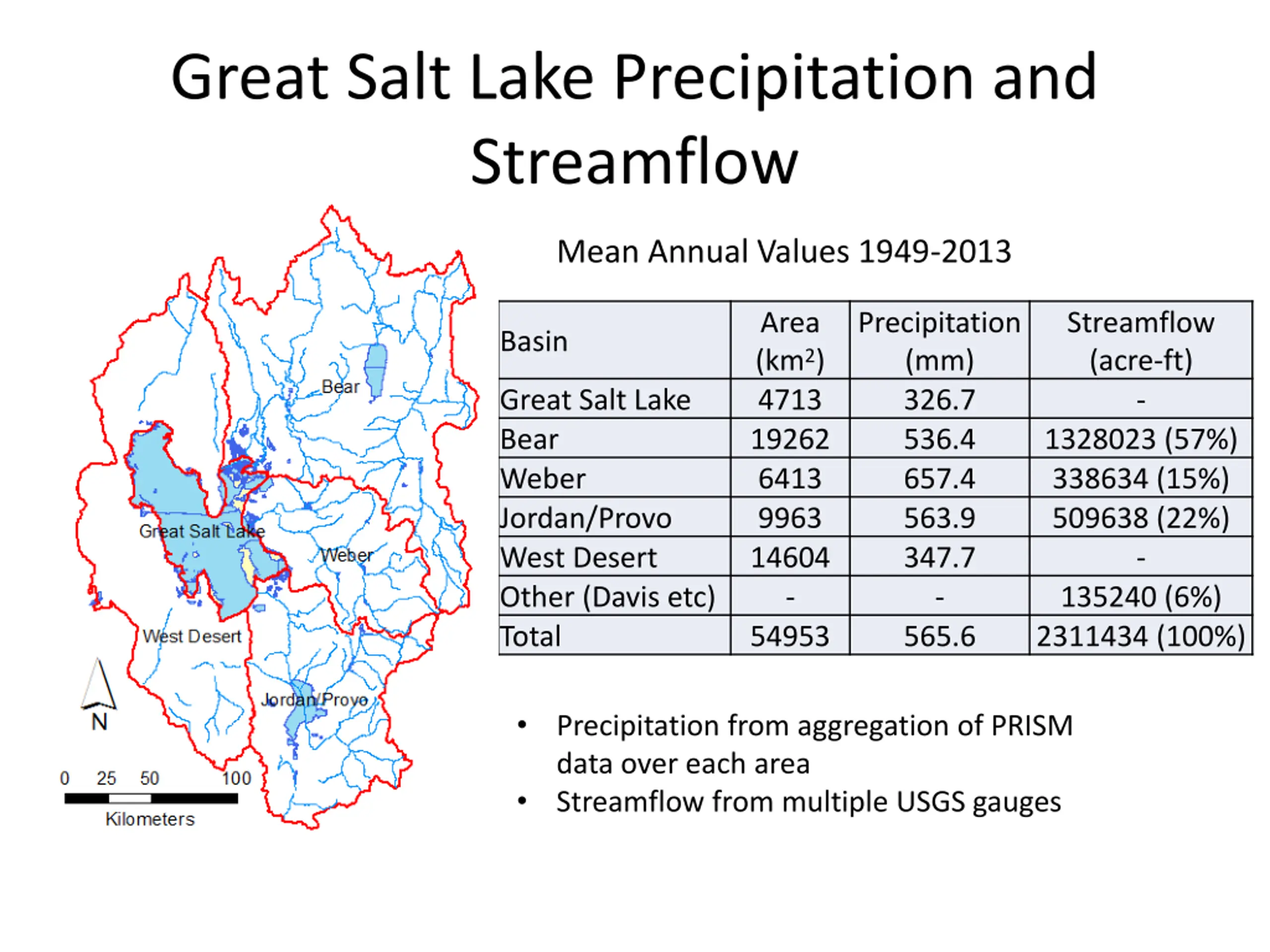 Great Salt Lake Precipitation and Streamflow Mean Annual Values 1949-2013 Area (km2) 4713 19262 6413 9963 14604 - 54953 Precipitation (mm) 326.7 536.4 657.4 563.9 347.7 - 565.6 Streamflow (acre-ft) - 1328023 (57%) 338634 (15%) 509638 (22%) - 135240 (6%) 2311434 (100%) Basin Great Salt Lake Bear Weber Jordan/Provo West Desert Other (Davis etc) Total Precipitation from aggregation of PRISM data over each area Streamflow from multiple USGS gauges