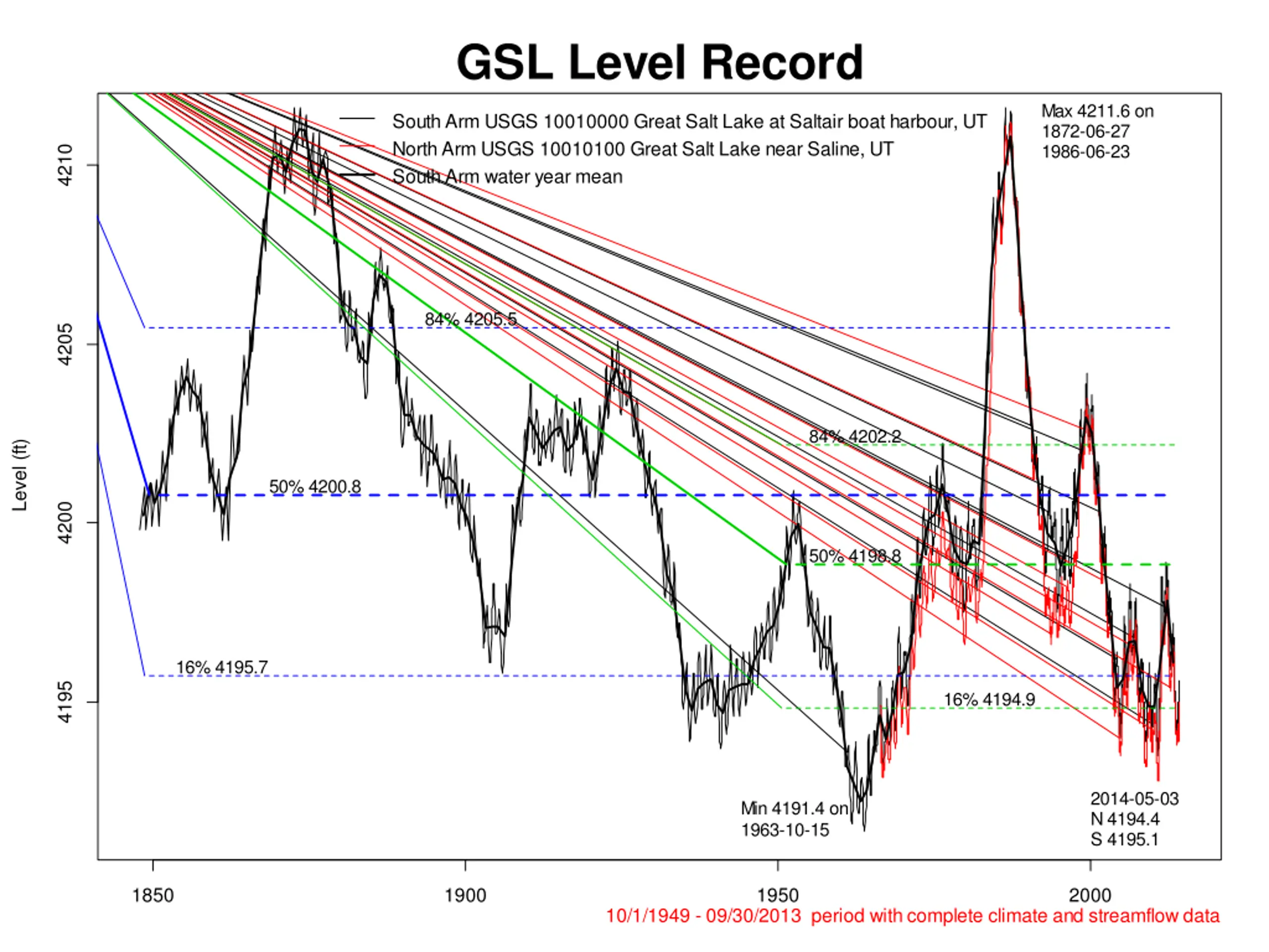 GSL Level Record Max 4211.6 on 1872-06-27 1986-06-23 South Arm USGS 10010000 Great Salt Lake at Saltair boat harbour, UT North Arm USGS 10010100 Great Salt Lake near Saline, UT South Arm water year mean 4210 84% 4205.5 4205 84% 4202.2 Level (ft) 50% 4200.8 4200 50% 4198.8 16% 4195.7 4195 16% 4194.9 2014-05-03 N 4194.4 S 4195.1 Min 4191.4 on 1963-10-15 1850 1900 1950 2000 10/1/1949 - 09/30/2013 period with complete climate and streamflow data