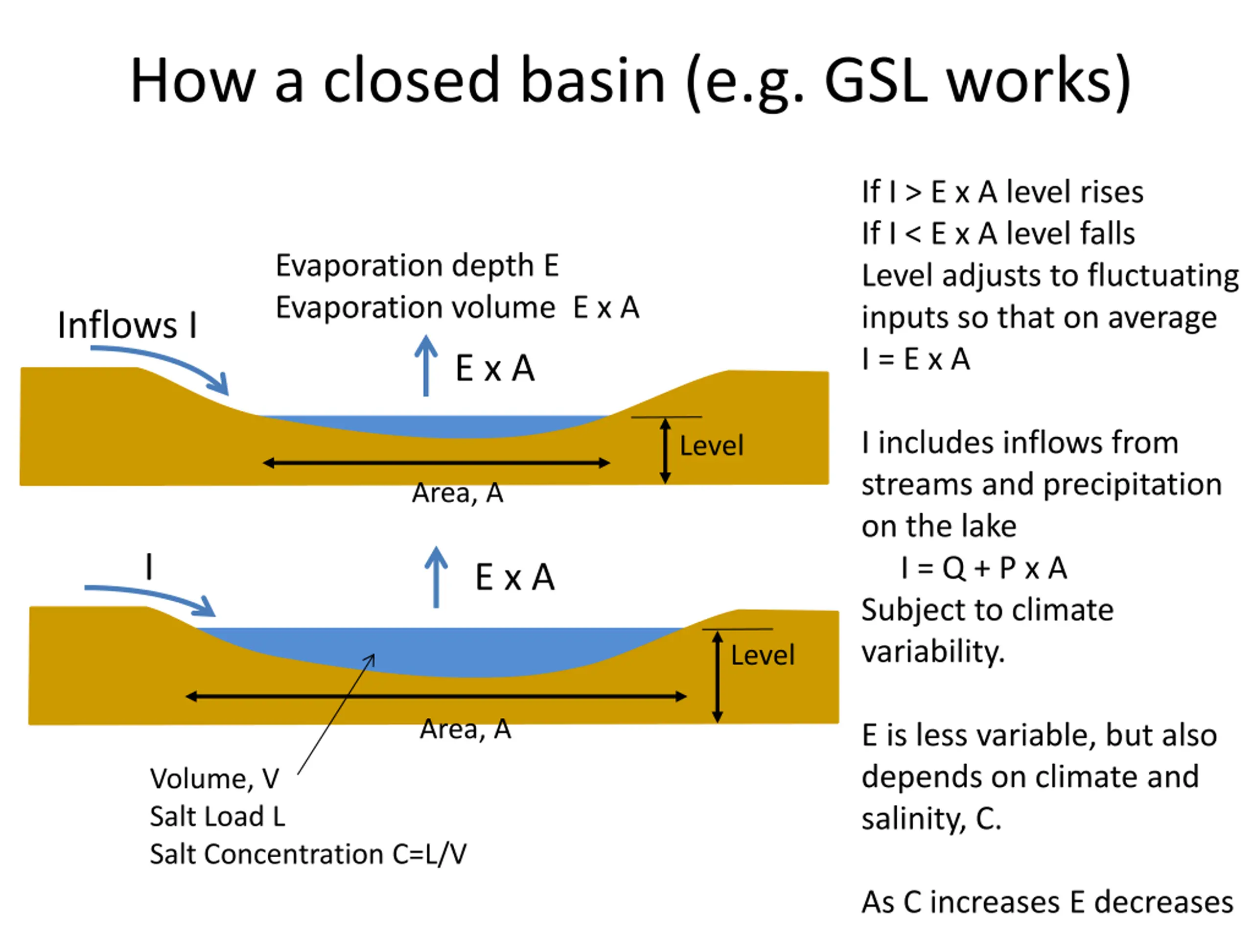 How a closed basin (e.g. GSL works) If I > E x A level rises If I < E x A level falls Level adjusts to fluctuating inputs so that on average I = E x A Evaporation depth E Evaporation volume E x A Inflows I E x A I includes inflows from streams and precipitation on the lake I = Q + P x A Subject to climate variability. Level Area, A I E x A Level Area, A E is less variable, but also depends on climate and salinity, C. Volume, V Salt Load L Salt Concentration C=L/V As C increases E decreases