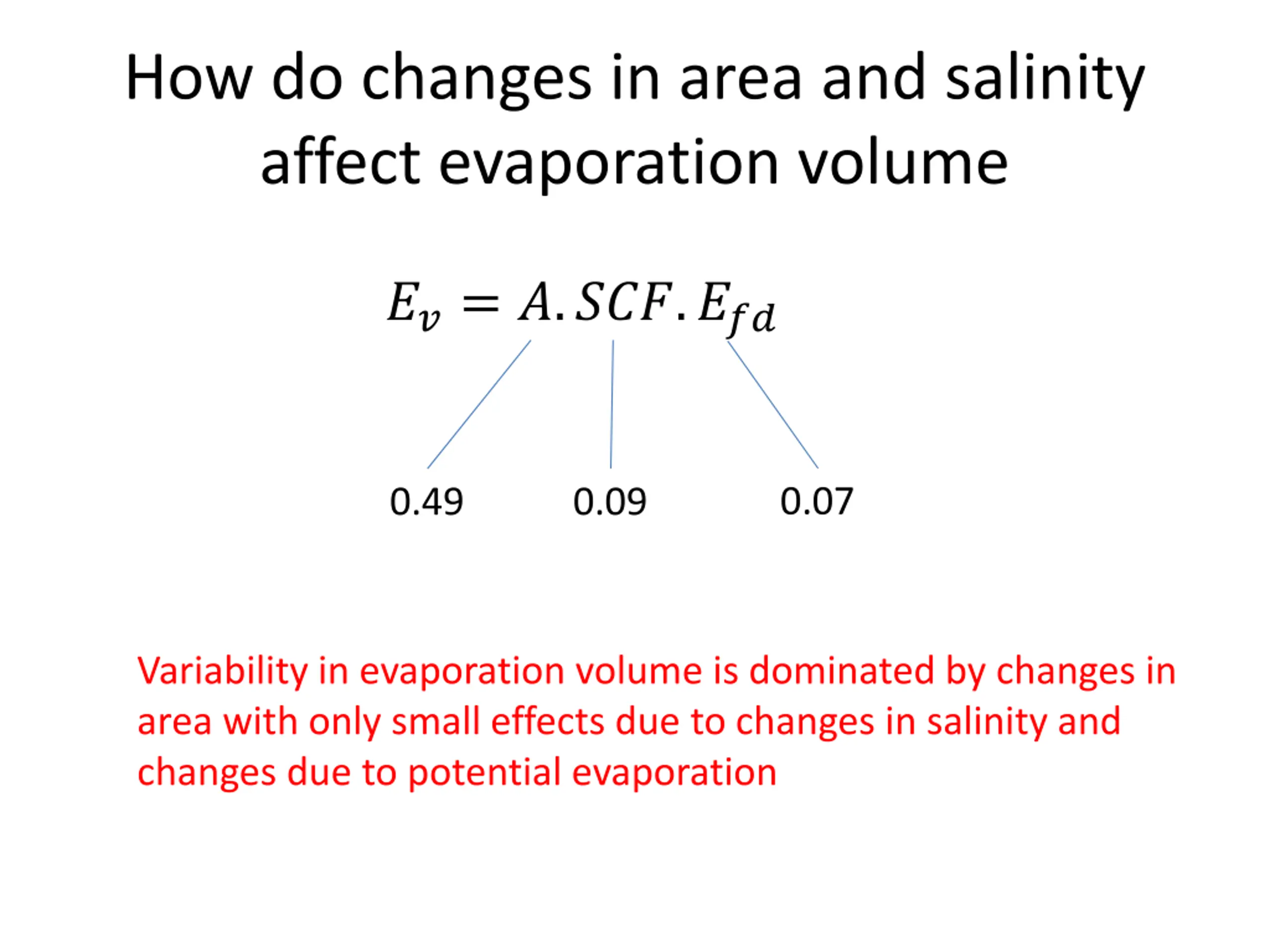 How do changes in area and salinity affect evaporation volume ??= ?.???.??? 0.07 0.49 0.09 Variability in evaporation volume is dominated by changes in area with only small effects due to changes in salinity and changes due to potential evaporation