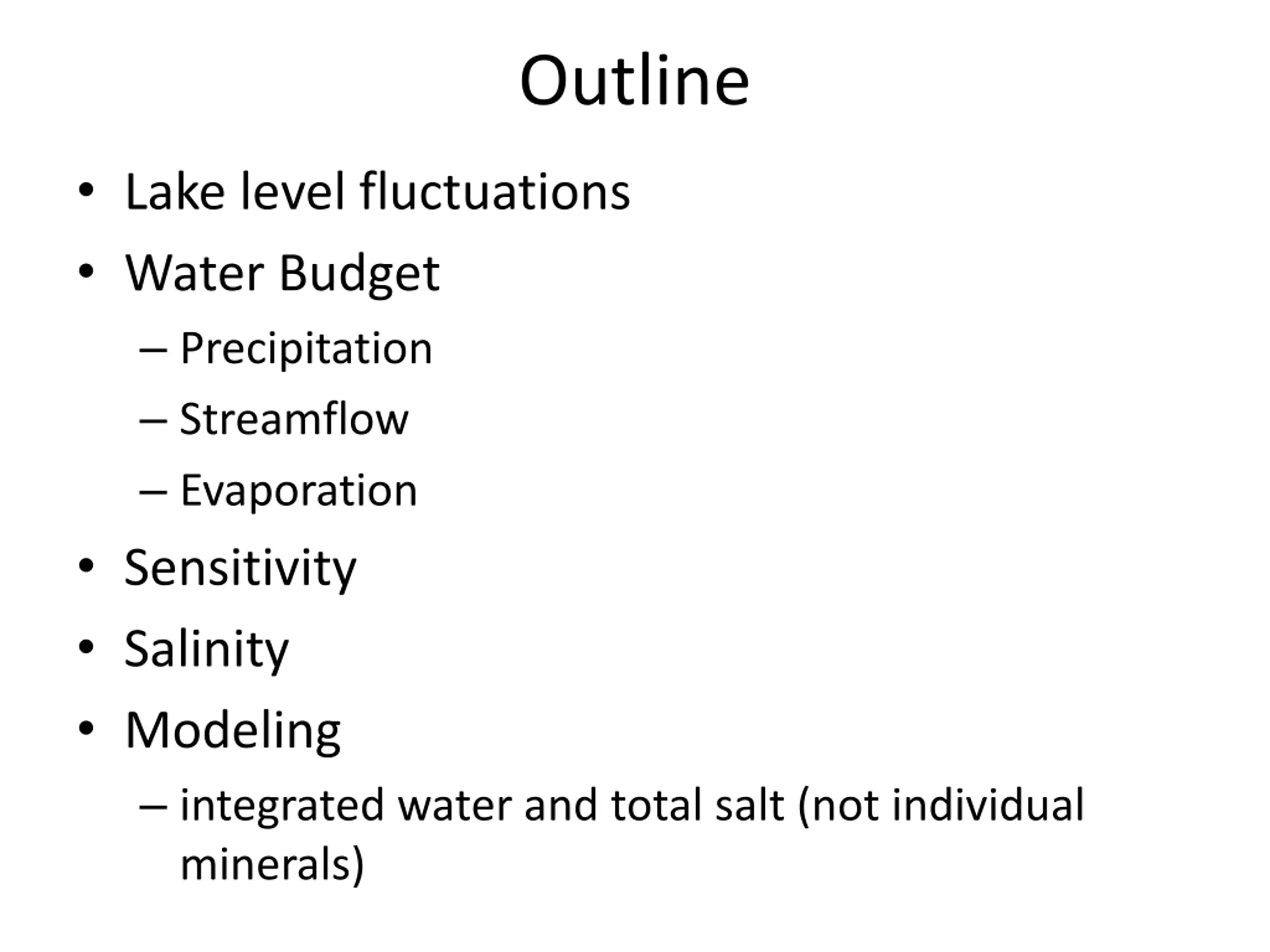 Outline Lake level fluctuations Water Budget Precipitation Streamflow Evaporation Sensitivity Salinity Modeling integrated water and total salt (not individual minerals)