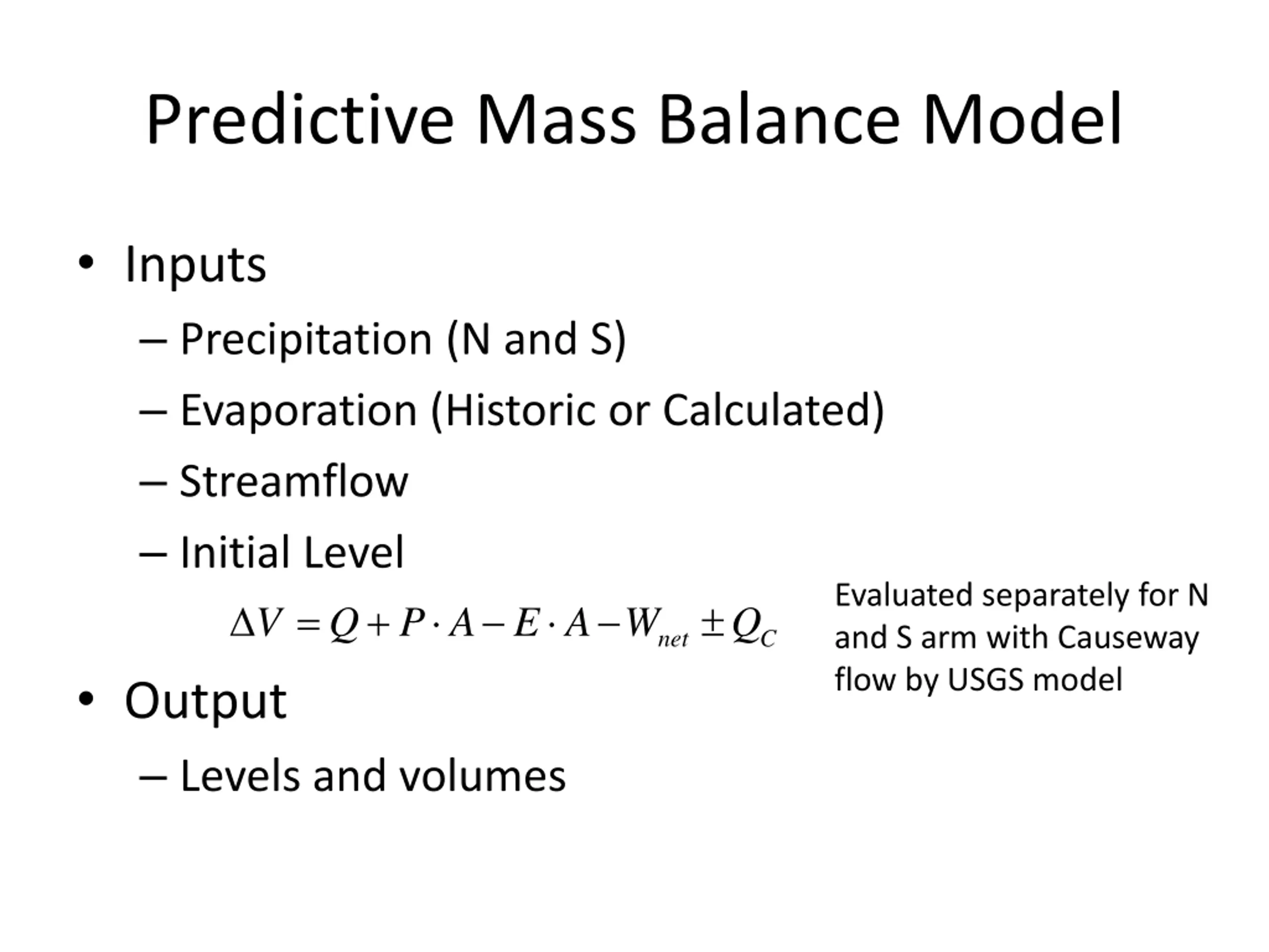 Predictive Mass Balance Model Inputs Precipitation (N and S) Evaporation (Historic or Calculated) Streamflow Initial Level A P Q V + = Evaluated separately for N and S arm with Causeway flow by USGS model E A W Q net C Output Levels and volumes