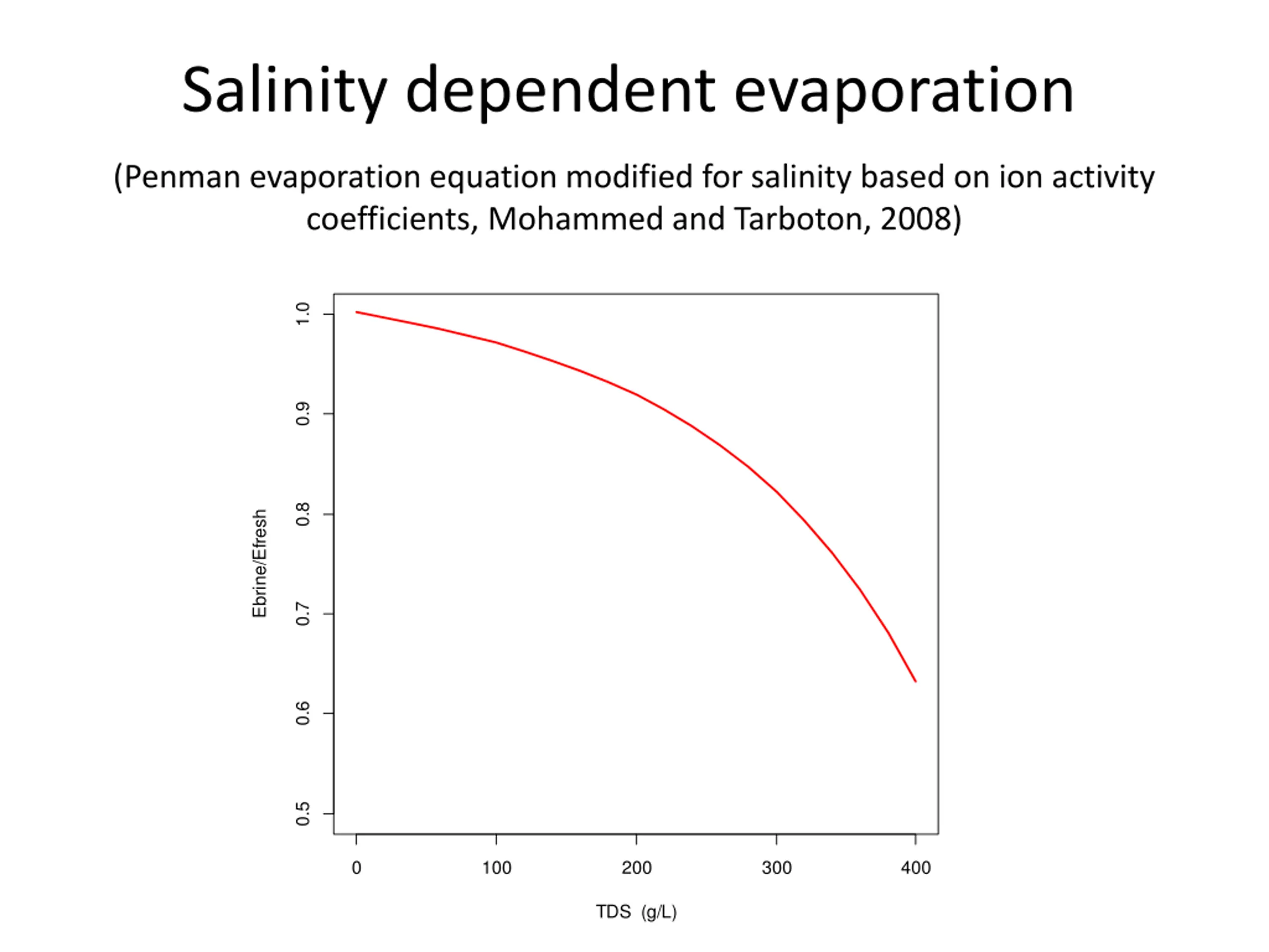 Salinity dependent evaporation (Penman evaporation equation modified for salinity based on ion activity coefficients, Mohammed and Tarboton, 2008) 1.0 0.9 0.8 Ebrine/Efresh 0.7 0.6 0.5 0 100 200 300 400 TDS (g/L)
