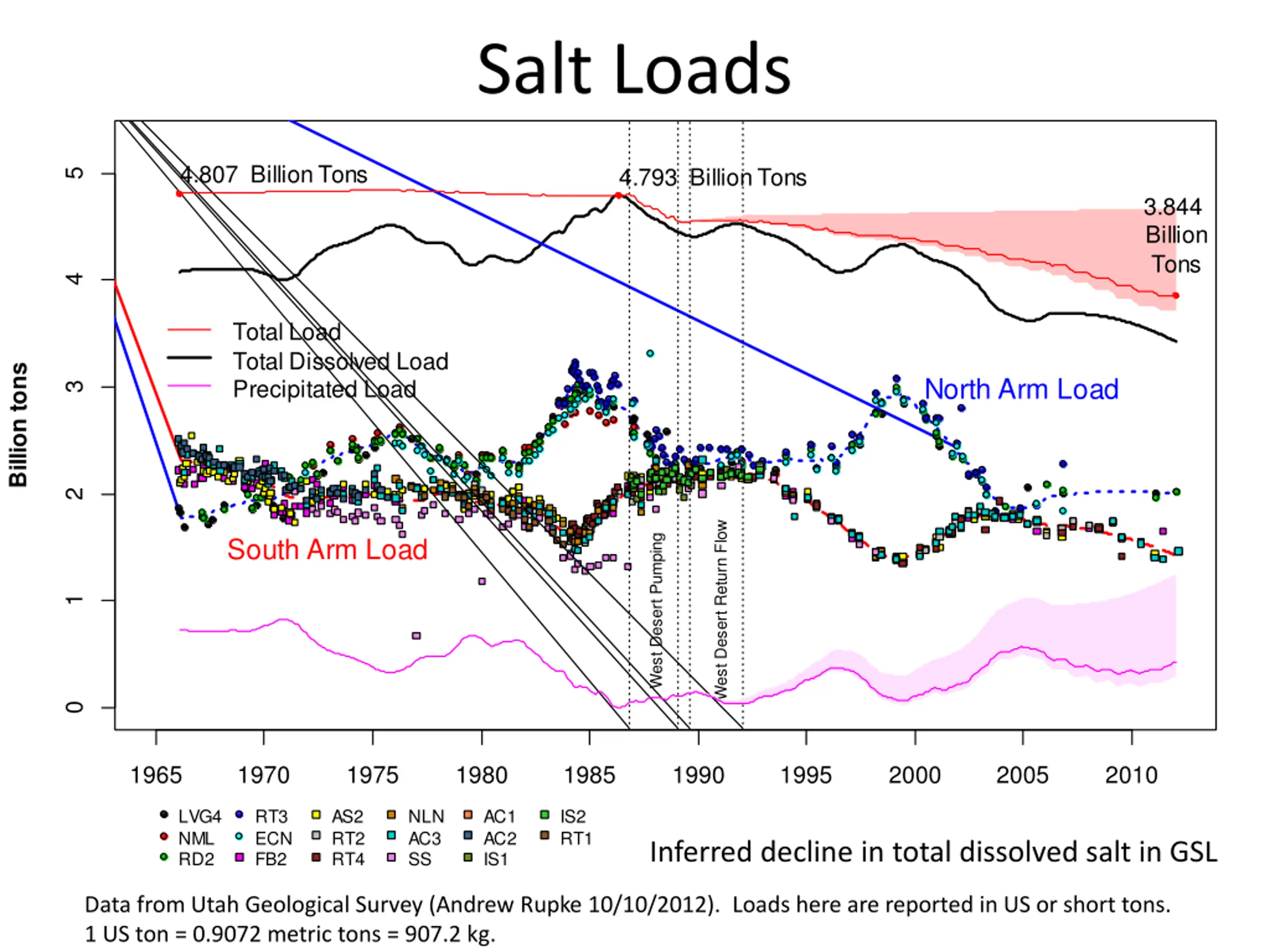 Salt Loads 4.807 Billion Tons 4.793 Billion Tons 5 3.844 Billion Tons 4 Total Load Total Dissolved Load Precipitated Load Billion tons North Arm Load 3 2 West Desert Return Flow South Arm Load West Desert Pumping 1 0 1965 1970 1975 1980 1985 1990 1995 2000 2005 2010 LVG4 NML RD2 RT3 ECN FB2 AS2 RT2 RT4 NLN AC3 SS AC1 AC2 IS1 IS2 RT1 Inferred decline in total dissolved salt in GSL Data from Utah Geological Survey (Andrew Rupke 10/10/2012). Loads here are reported in US or short tons. 1 US ton = 0.9072 metric tons = 907.2 kg.