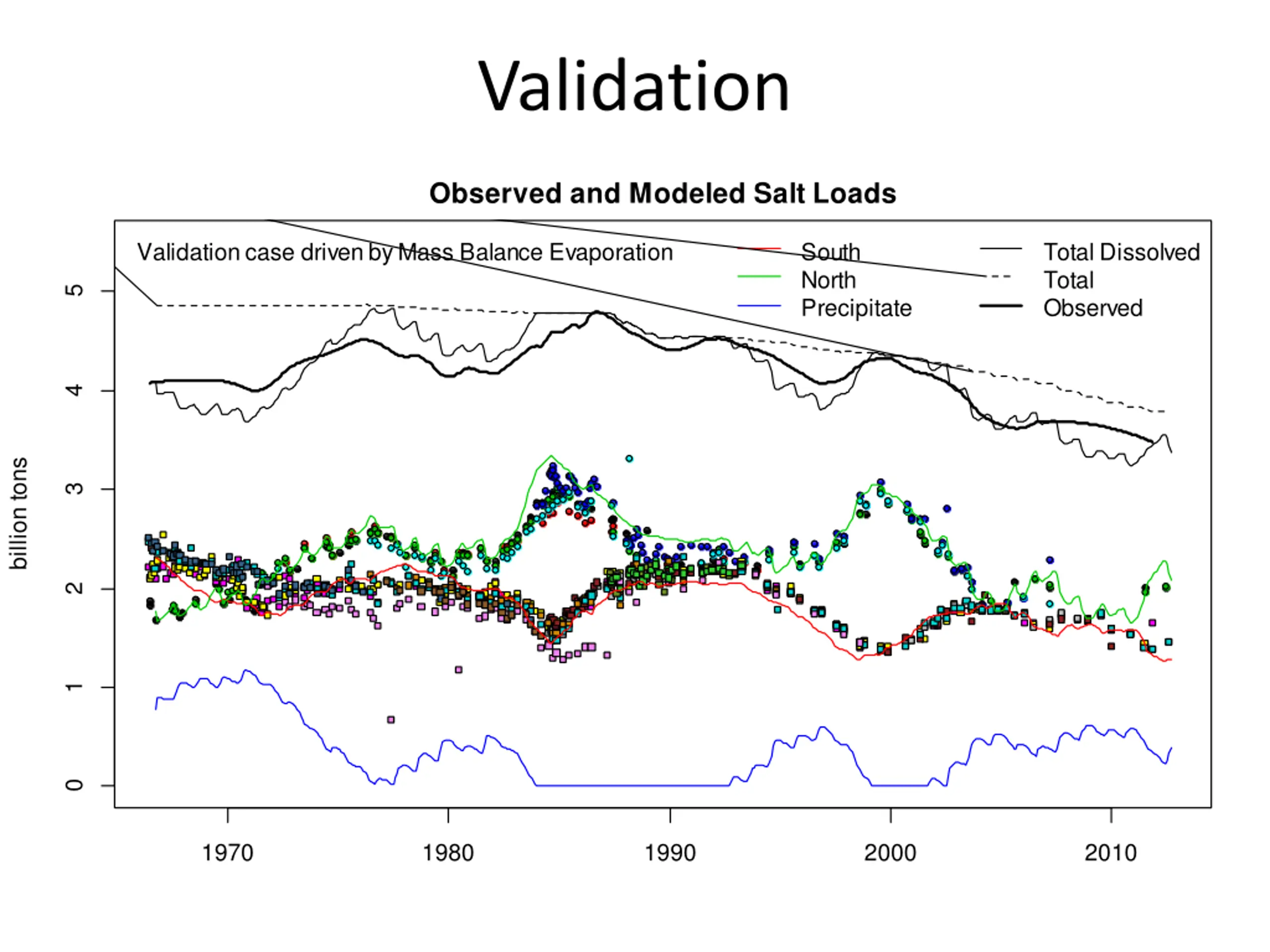 Validation Observed and Modeled Salt Loads Validation case driven by Mass Balance Evaporation South North Precipitate Total Dissolved Total Observed 5 4 billion tons 3 2 1 0 1970 1980 1990 2000 2010