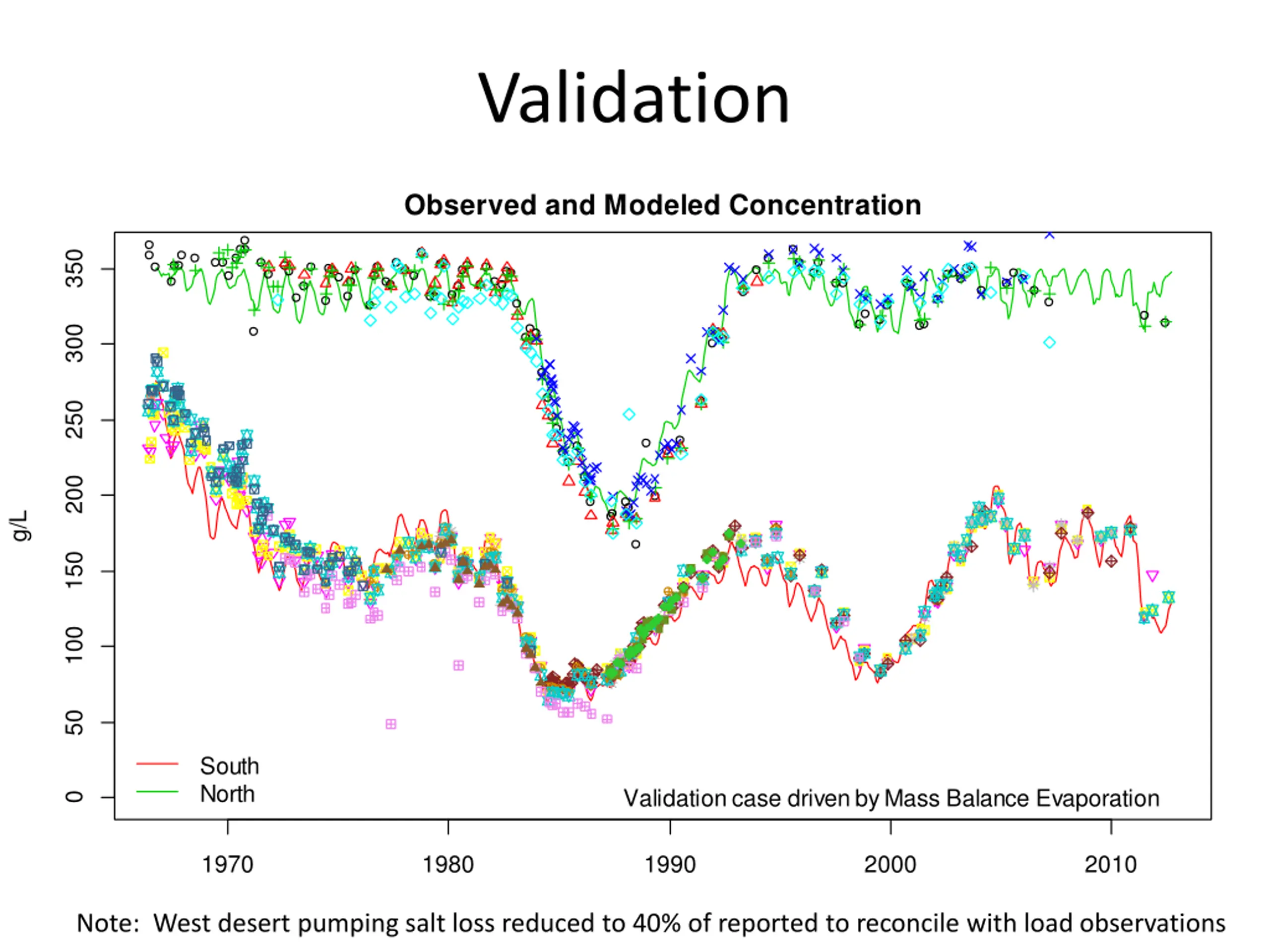 Validation Observed and Modeled Concentration 350 300 250 200 g/L 150 100 50 South North Validation case driven by Mass Balance Evaporation 0 1970 1980 1990 2000 2010 Note: West desert pumping salt loss reduced to 40% of reported to reconcile with load observations