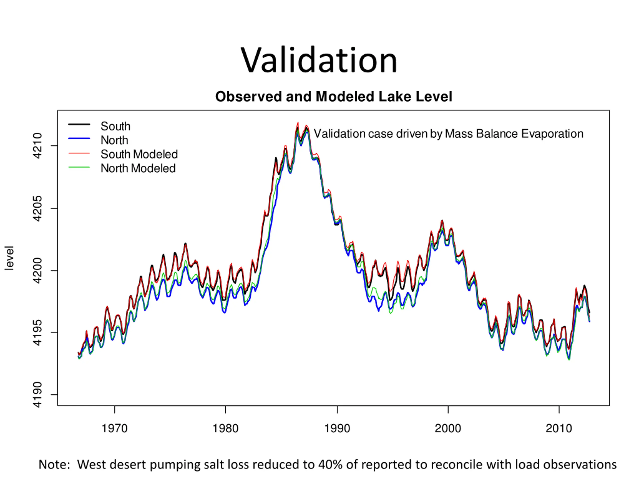 Validation Observed and Modeled Lake Level South North South Modeled North Modeled Validation case driven by Mass Balance Evaporation 4210 4205 level 4200 4195 4190 1970 1980 1990 2000 2010 Note: West desert pumping salt loss reduced to 40% of reported to reconcile with load observations