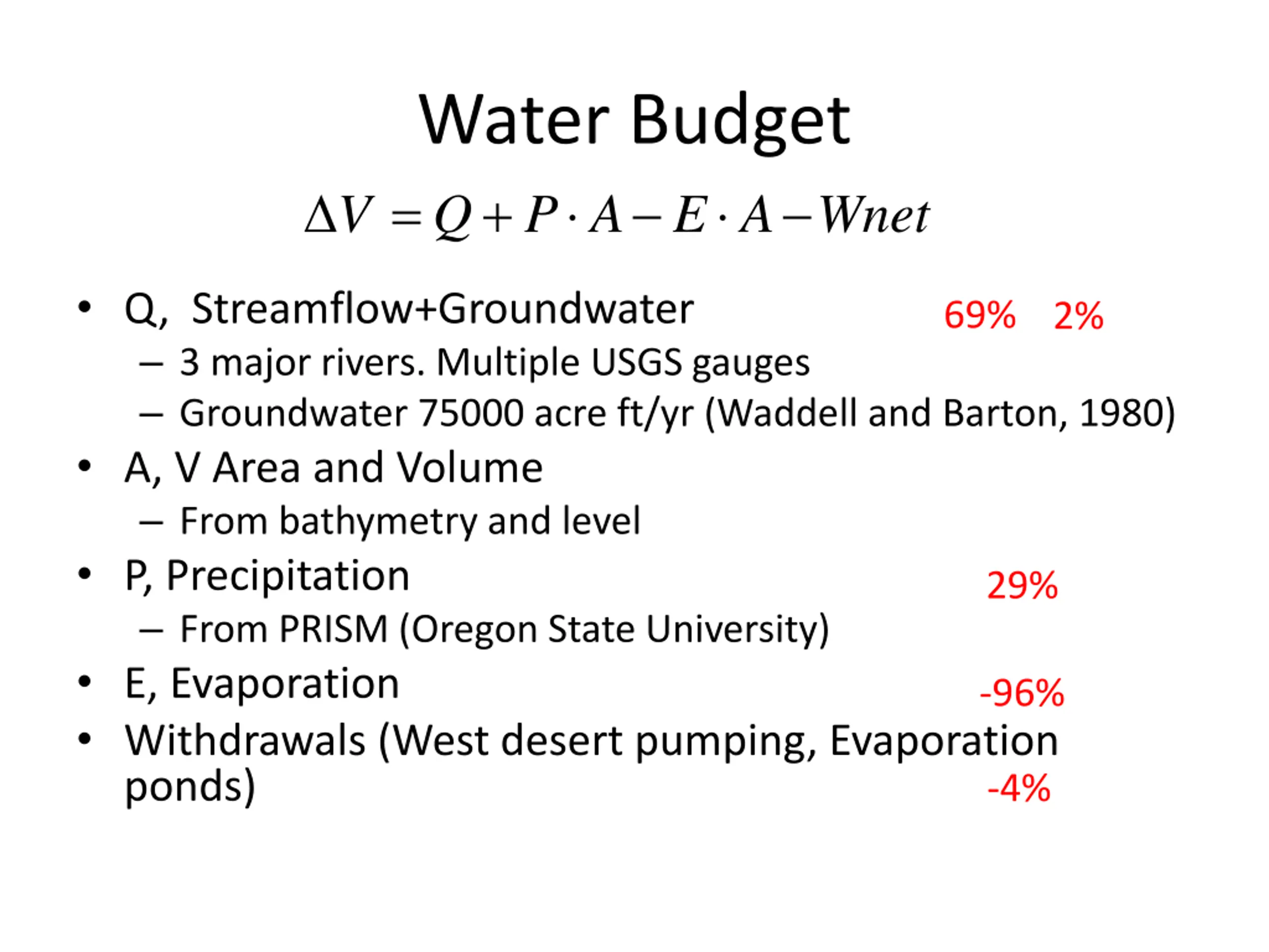 Water Budget A P Q + = V E A Wnet Q, Streamflow+Groundwater 3 major rivers. Multiple USGS gauges Groundwater 75000 acre ft/yr (Waddell and Barton, 1980) A, V Area and Volume From bathymetry and level P, Precipitation From PRISM (Oregon State University) E, Evaporation Withdrawals (West desert pumping, Evaporation ponds) 69% 2% 29% -96% -4%