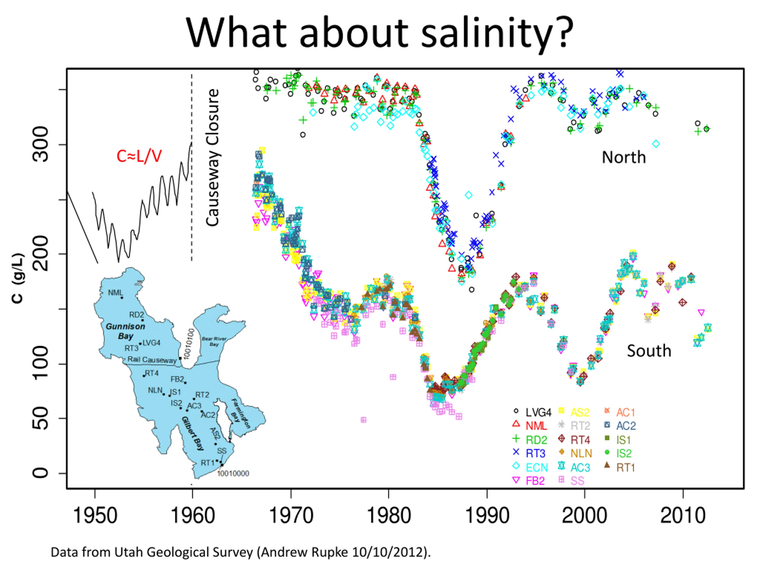 What about salinity? Causeway Closure 300 C L/V North 200 C (g/L) Causeway closure South 100 LVG4 NML RD2 RT3 ECN FB2 AS2 RT2 RT4 NLN AC3 SS AC1 AC2 IS1 IS2 RT1 50 0 1950 1960 1970 1980 1990 2000 2010 Data from Utah Geological Survey (Andrew Rupke 10/10/2012).