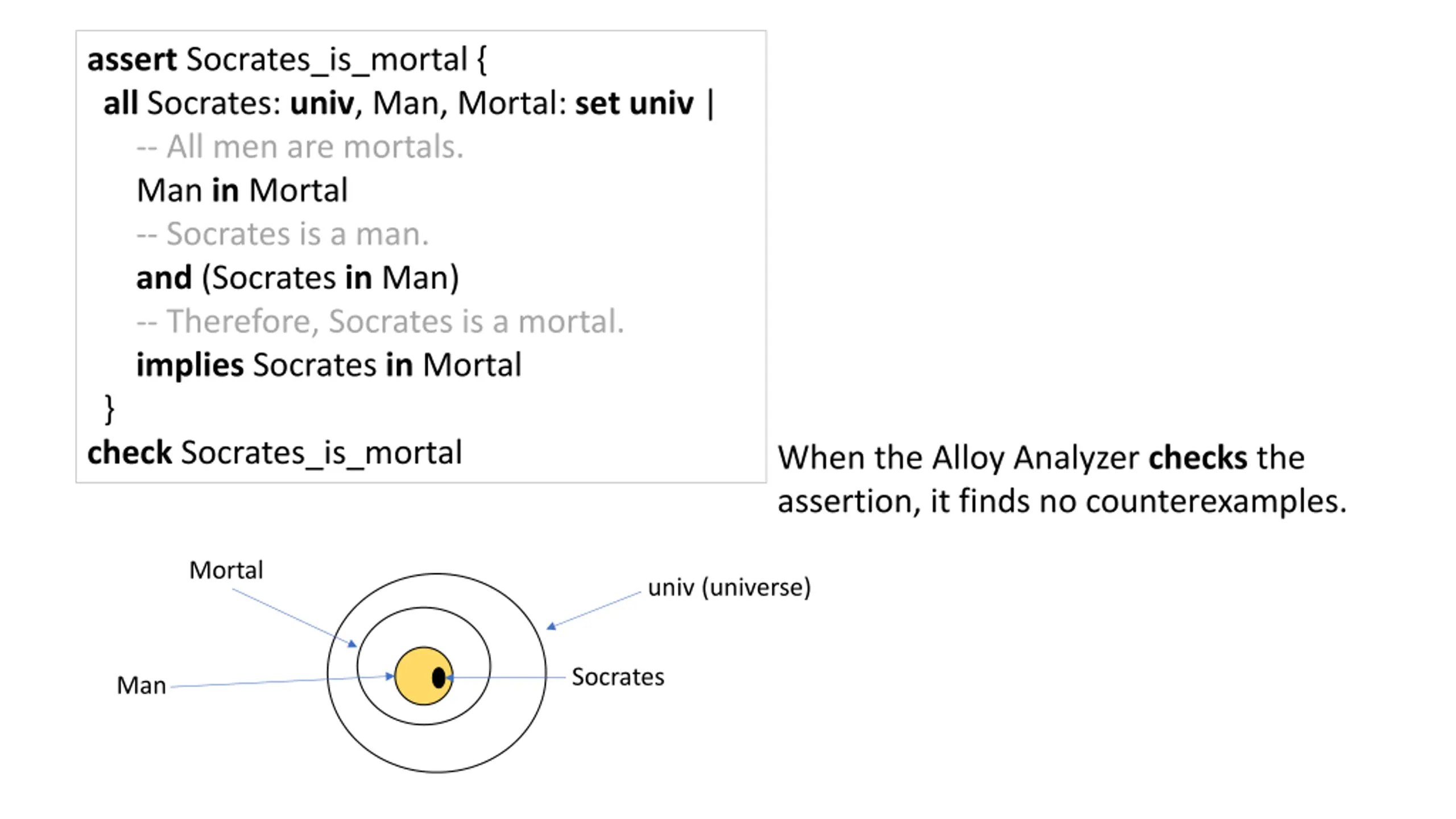 assert Socrates_is_mortal { all Socrates: univ, Man, Mortal: setuniv | -- All men are mortals. Man in Mortal -- Socrates is a man. and (Socrates in Man) -- Therefore, Socrates is a mortal. implies Socrates in Mortal } check Socrates_is_mortal When the Alloy Analyzer checks the assertion, it finds no counterexamples. Mortal univ (universe) Socrates Man