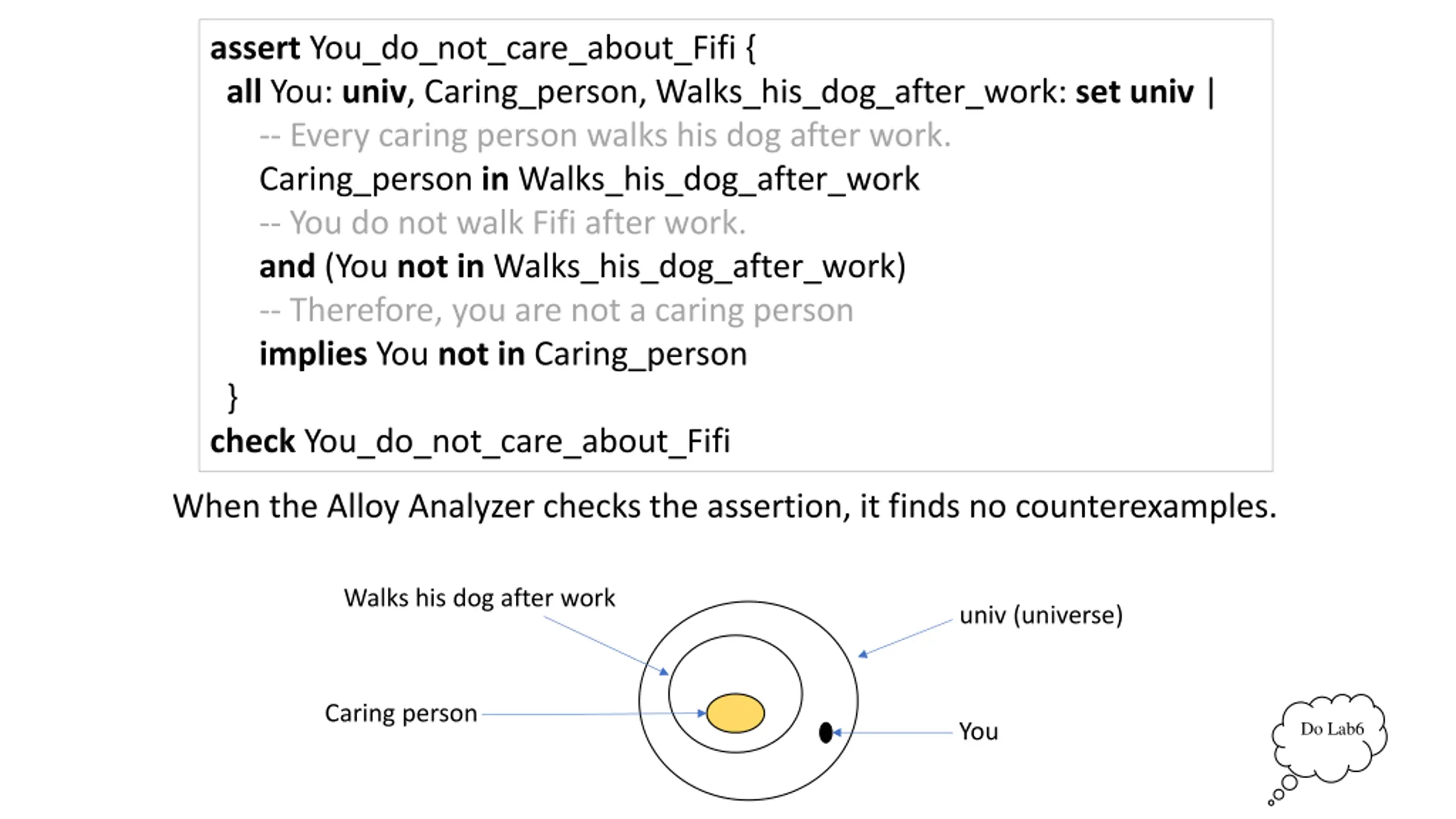 assert You_do_not_care_about_Fifi { all You: univ, Caring_person, Walks_his_dog_after_work: setuniv | -- Every caring person walks his dog after work. Caring_person in Walks_his_dog_after_work -- You do not walk Fifi after work. and (You notin Walks_his_dog_after_work) -- Therefore, you are not a caring person implies You notin Caring_person } check You_do_not_care_about_Fifi When the Alloy Analyzer checks the assertion, it finds no counterexamples. Walks his dog after work univ (universe) Caring person Do Lab6 You