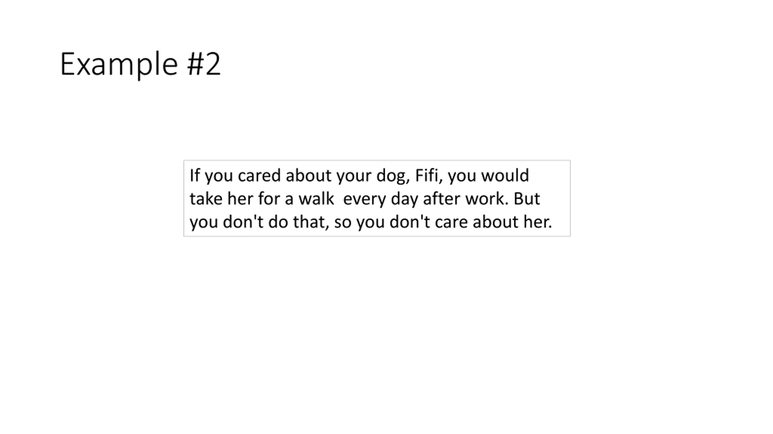 Example #2 If you cared about your dog, Fifi, you would take her for a walk every day after work. But you don't do that, so you don't care about her.