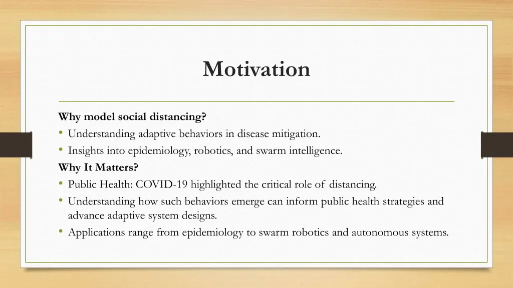 Motivation Why model social distancing? Understanding adaptive behaviors in disease mitigation. Insights into epidemiology, robotics, and swarm intelligence. Why It Matters? Public Health: COVID-19 highlighted the critical role of distancing. Understanding how such behaviors emerge can inform public health strategies and advance adaptive system designs. Applications range from epidemiology to swarm robotics and autonomous systems.