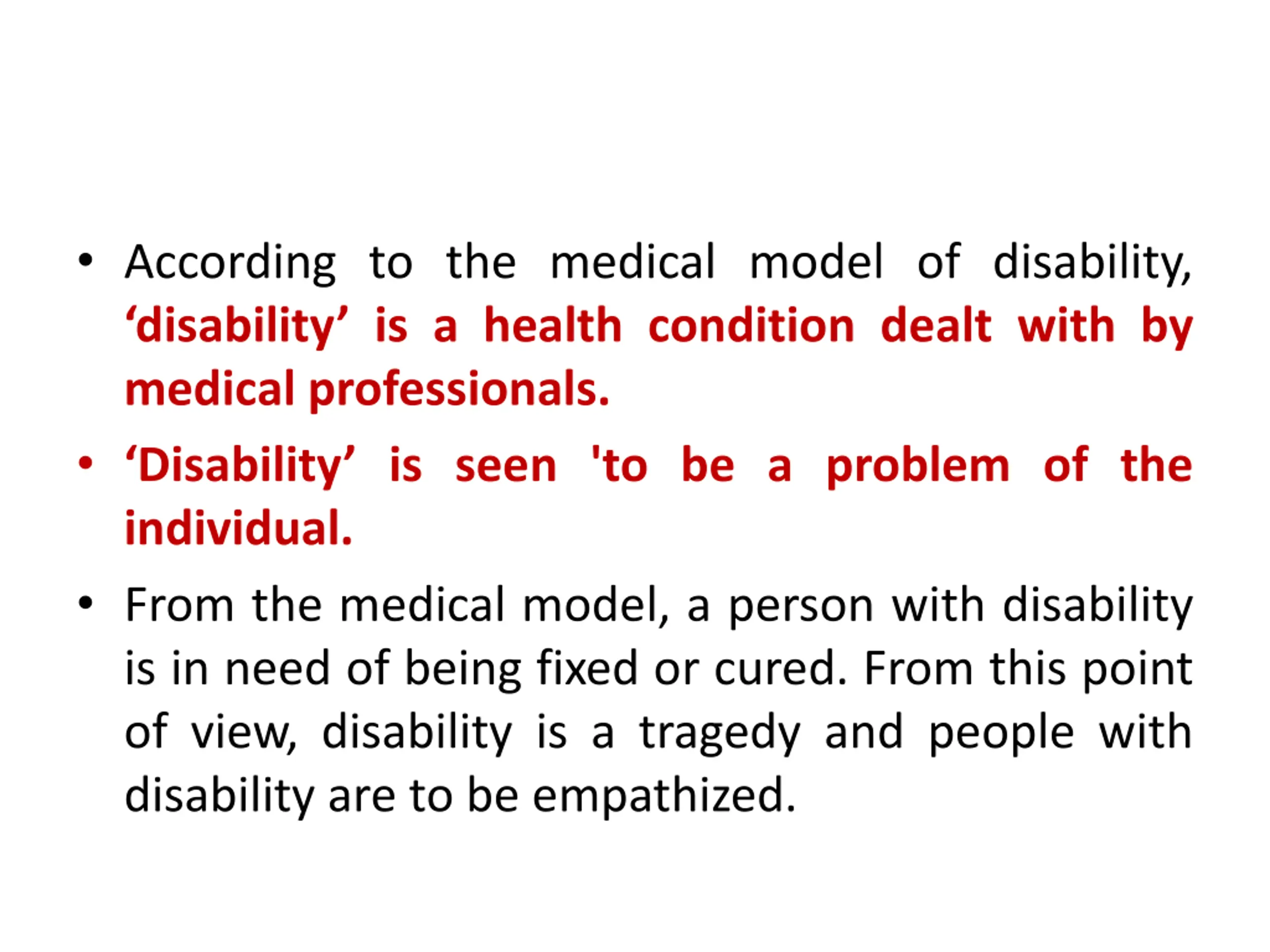 According to the medical model of disability, disability is a health condition dealt with by medical professionals. Disability is seen 'to be a problem of the individual. From the medical model, a person with disability is in need of being fixed or cured. From this point of view, disability is a tragedy and people with disability are to be empathized.