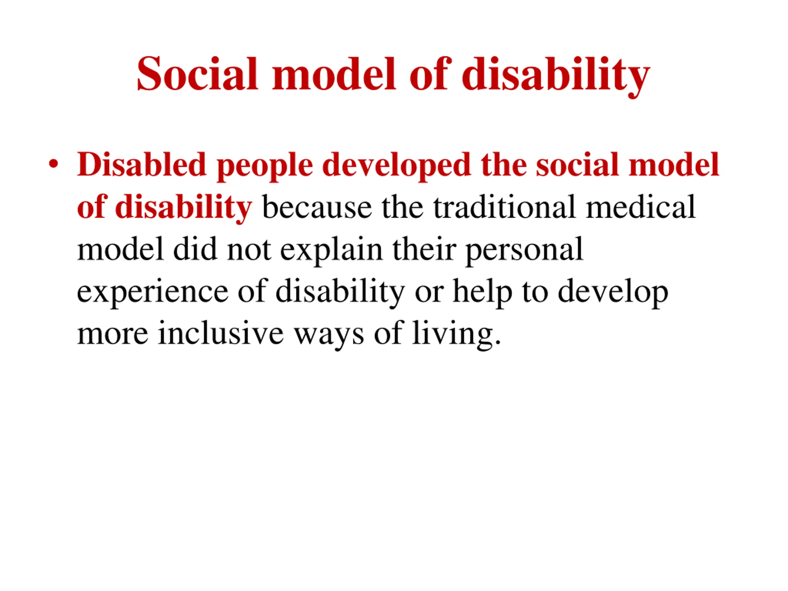 Social model of disability Disabled people developed the social model of disability because the traditional medical model did not explain their personal experience of disability or help to develop more inclusive ways of living.