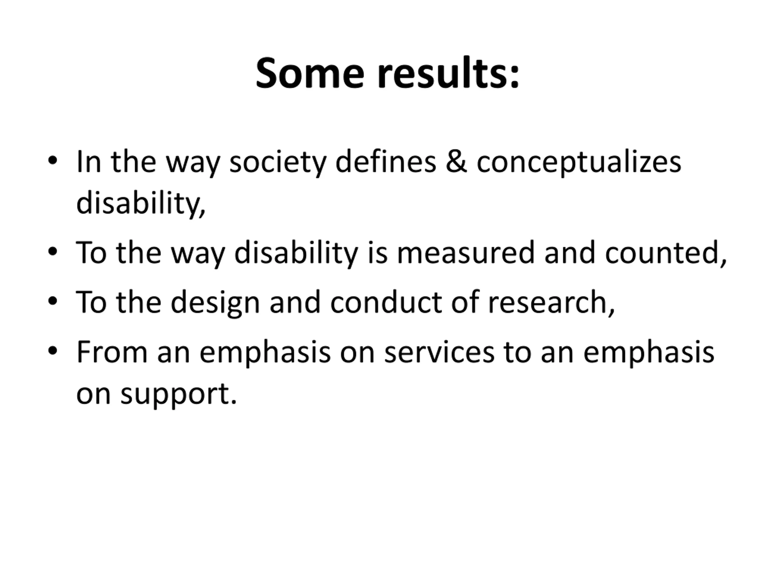 Some results: In the way society defines & conceptualizes disability, To the way disability is measured and counted, To the design and conduct of research, From an emphasis on services to an emphasis on support.