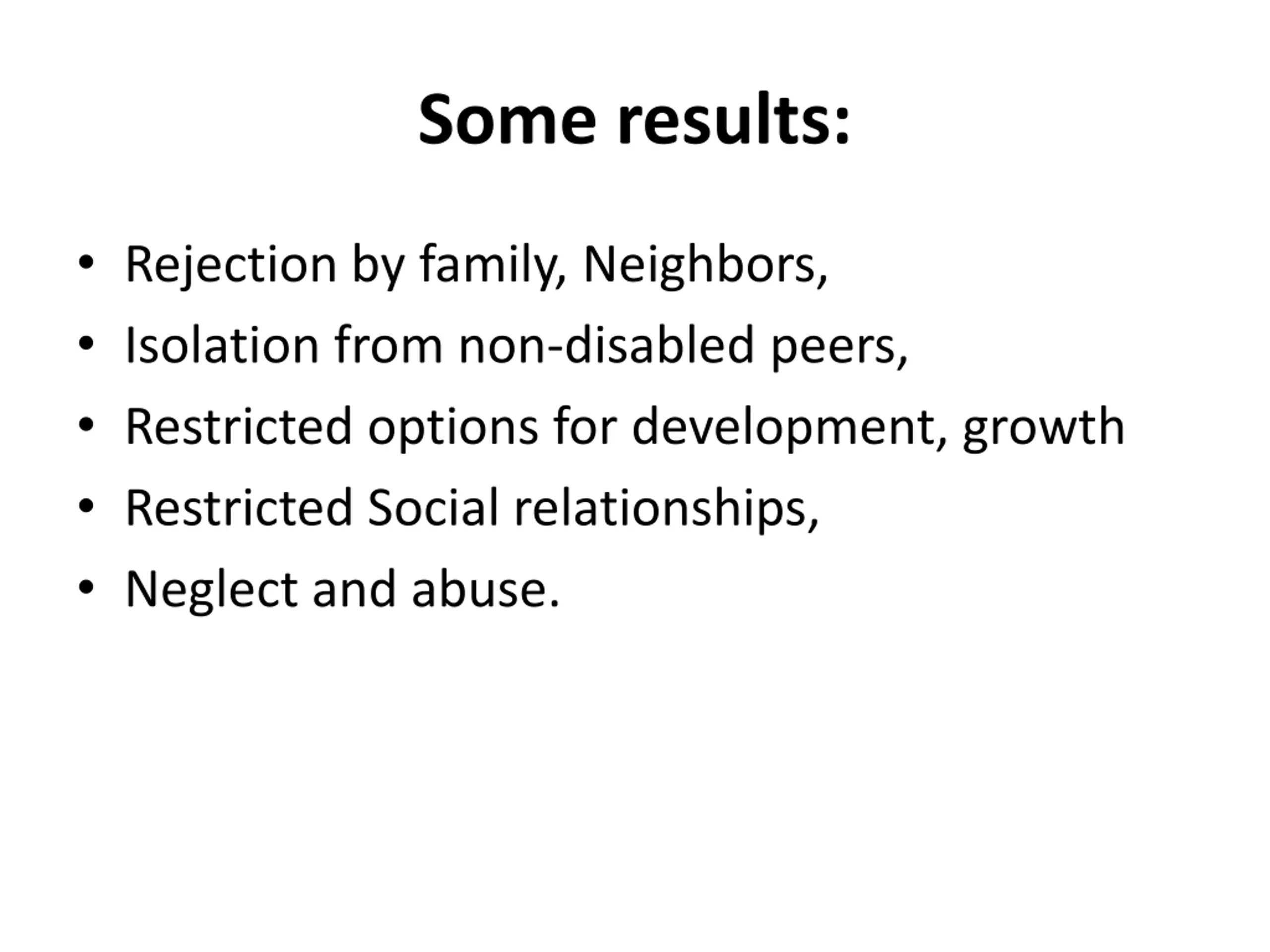 Some results: Rejection by family, Neighbors, Isolation from non-disabled peers, Restricted options for development, growth Restricted Social relationships, Neglect and abuse.