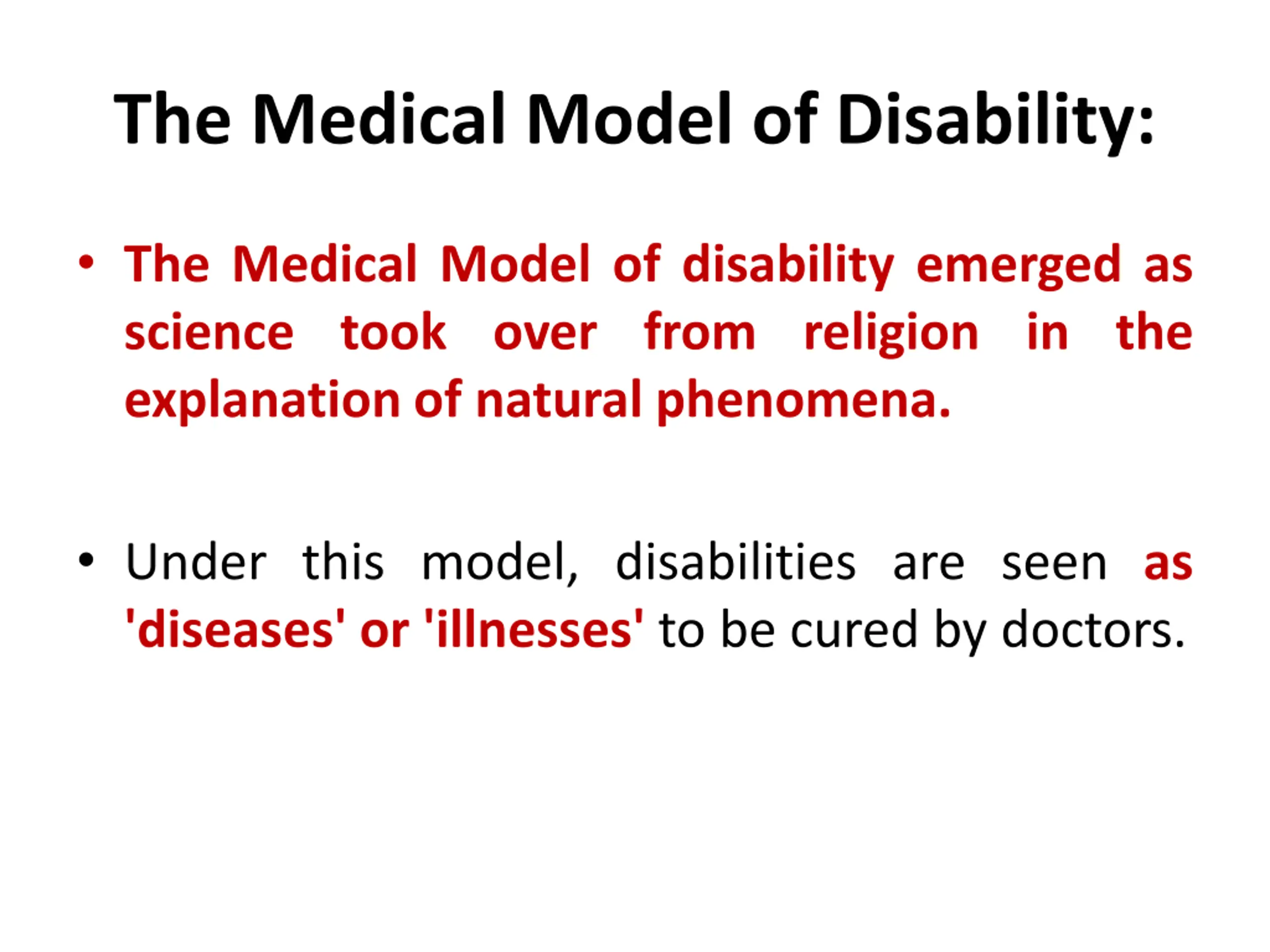 The Medical Model of Disability: The Medical Model of disability emerged as science took over from religion in the explanation of natural phenomena. Under this model, disabilities are seen as 'diseases' or 'illnesses' to be cured by doctors.