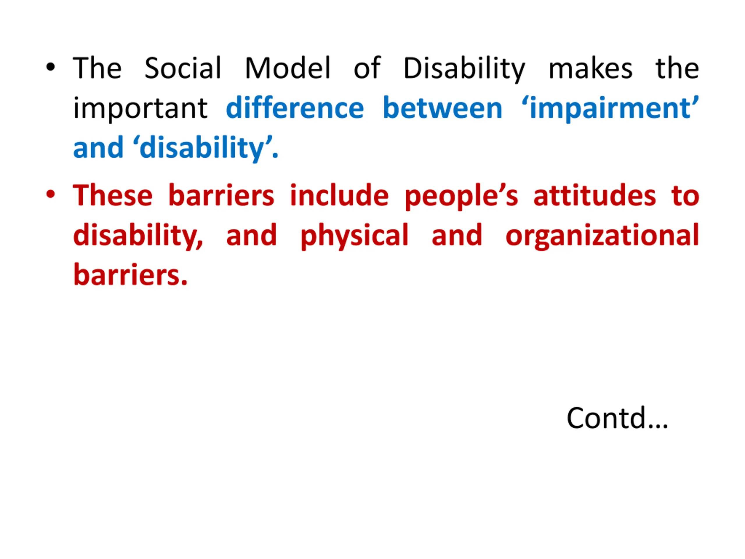 The Social Model of Disability makes the important difference between impairment and disability . These barriers include people s attitudes to disability, and physical and organizational barriers. Contd