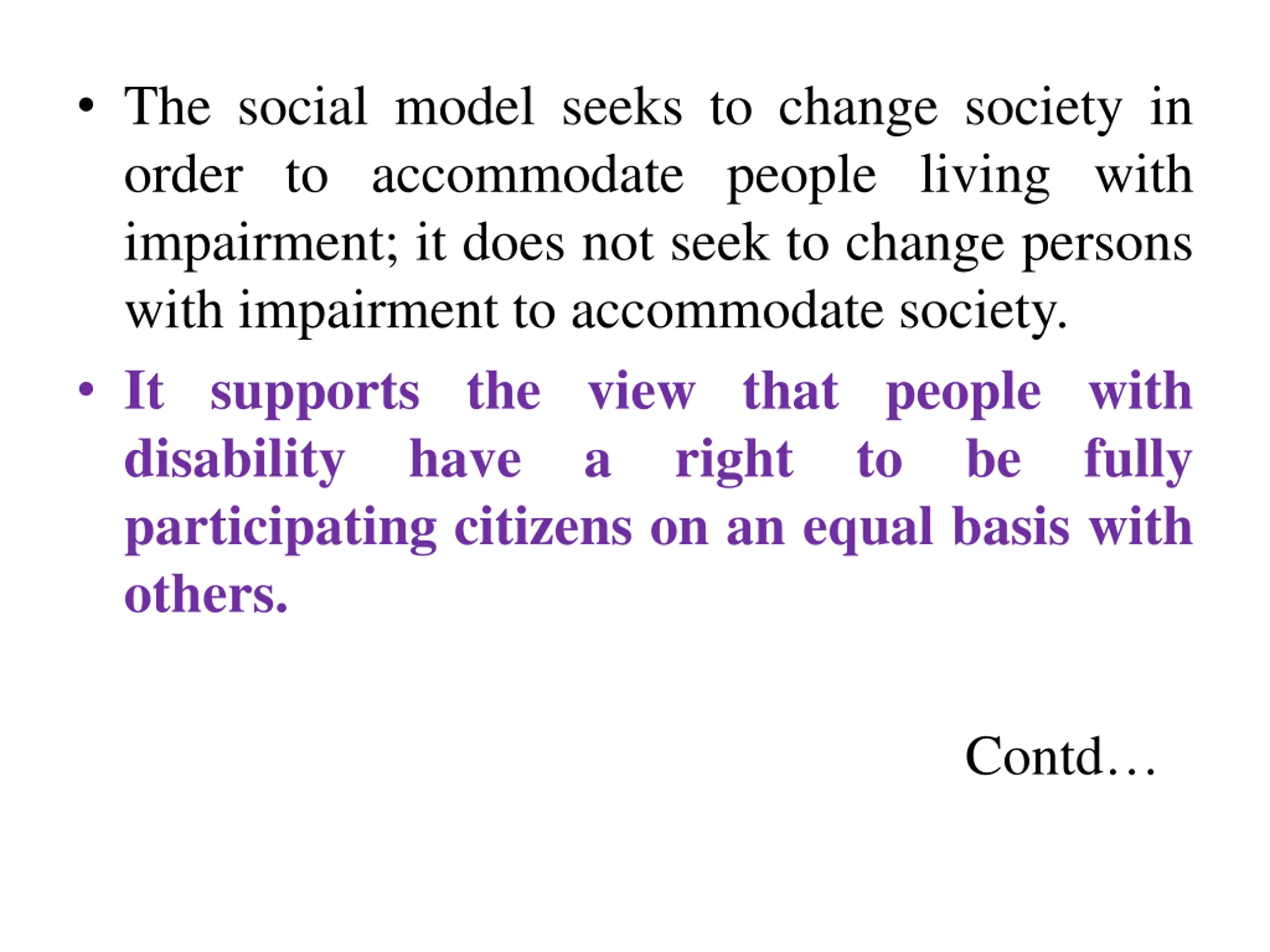 The social model seeks to change society in order to accommodate people living with impairment; it does not seek to change persons with impairment to accommodate society. It supports the view that people with disability have a participating citizens on an equal basis with others. right to be fully Contd