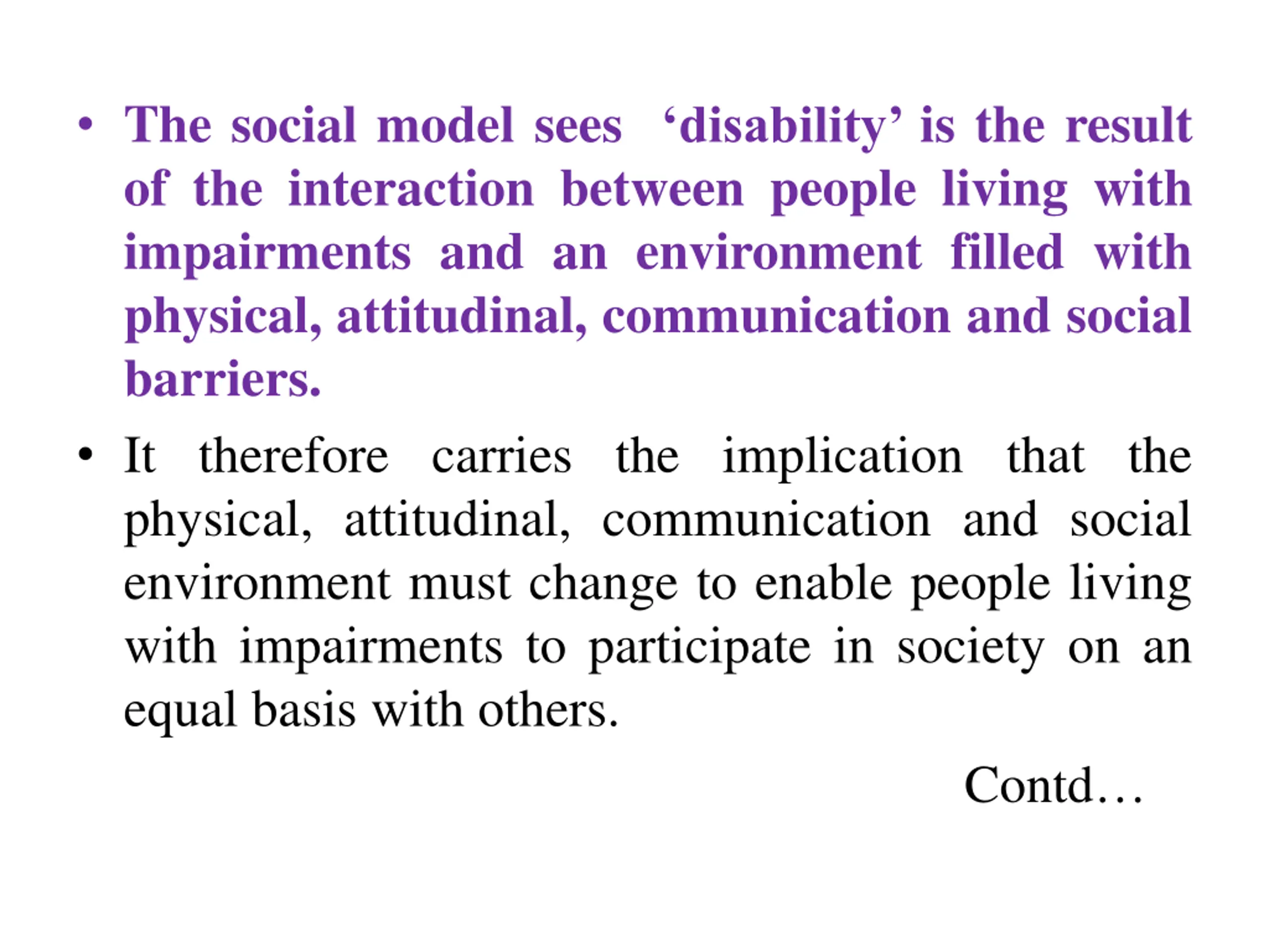 The social model sees disability is the result of the interaction between people living with impairments and an environment filled with physical, attitudinal, communication and social barriers. It therefore carries the implication that the physical, attitudinal, communication and social environment must change to enable people living with impairments to participate in society on an equal basis with others. Contd