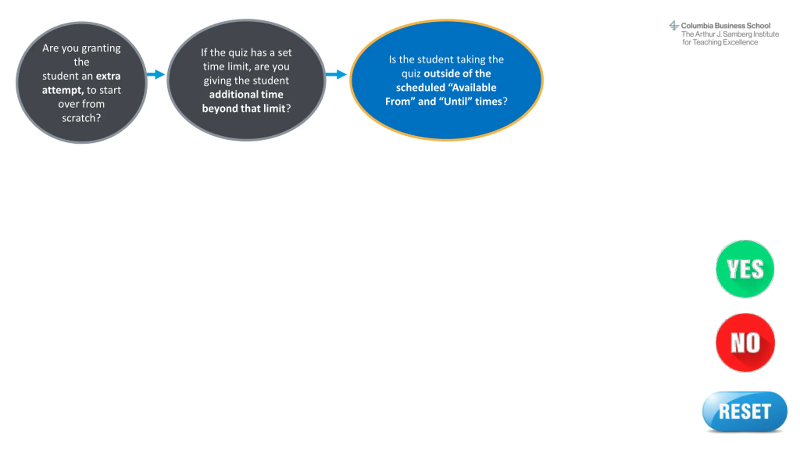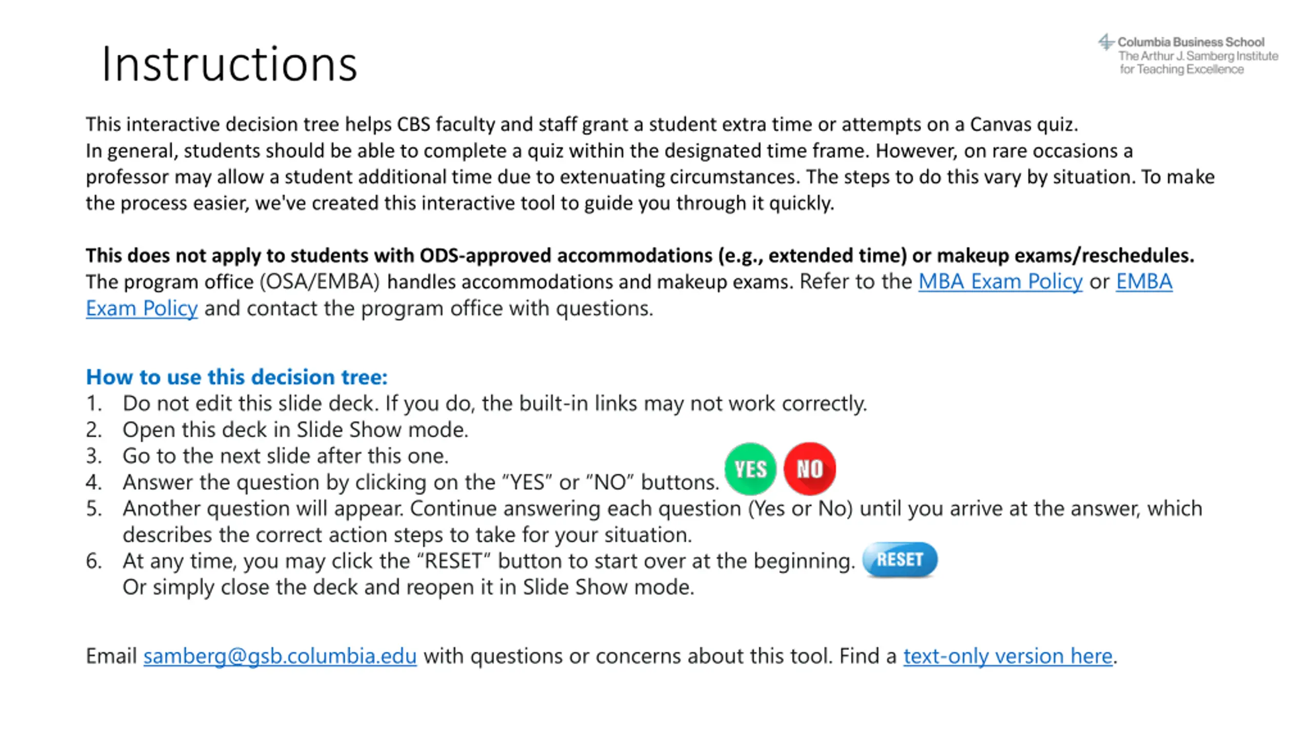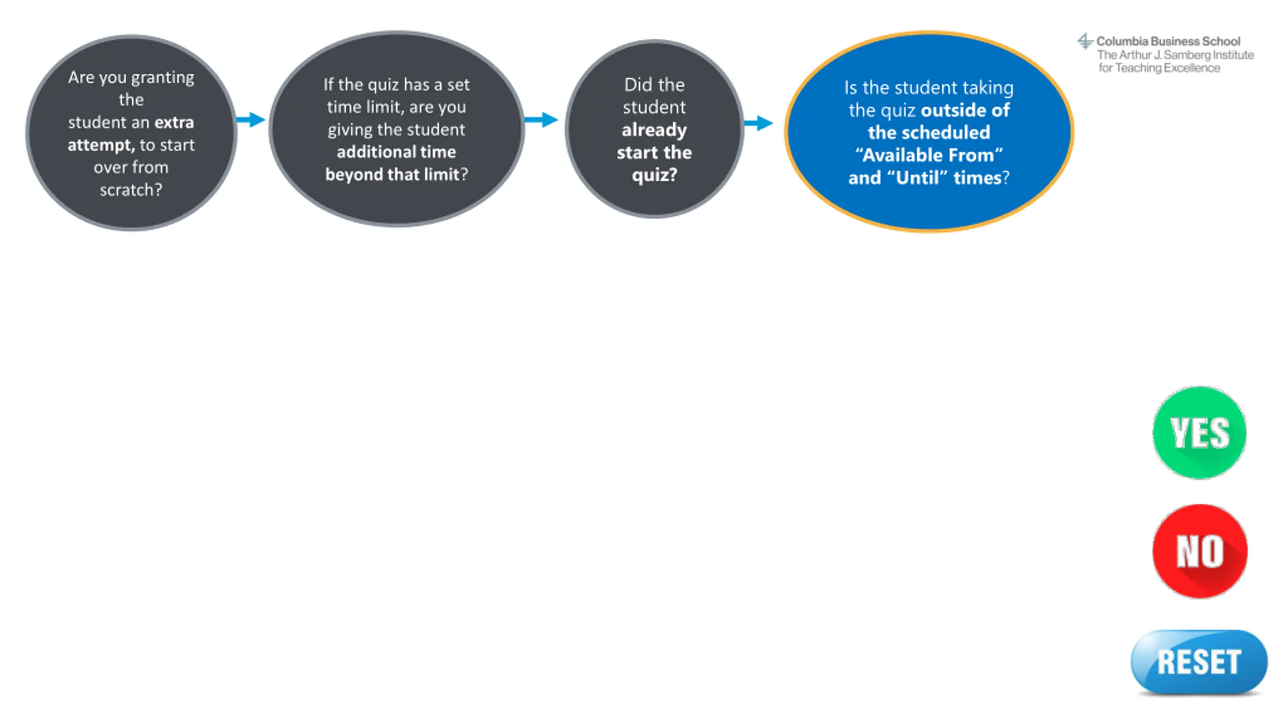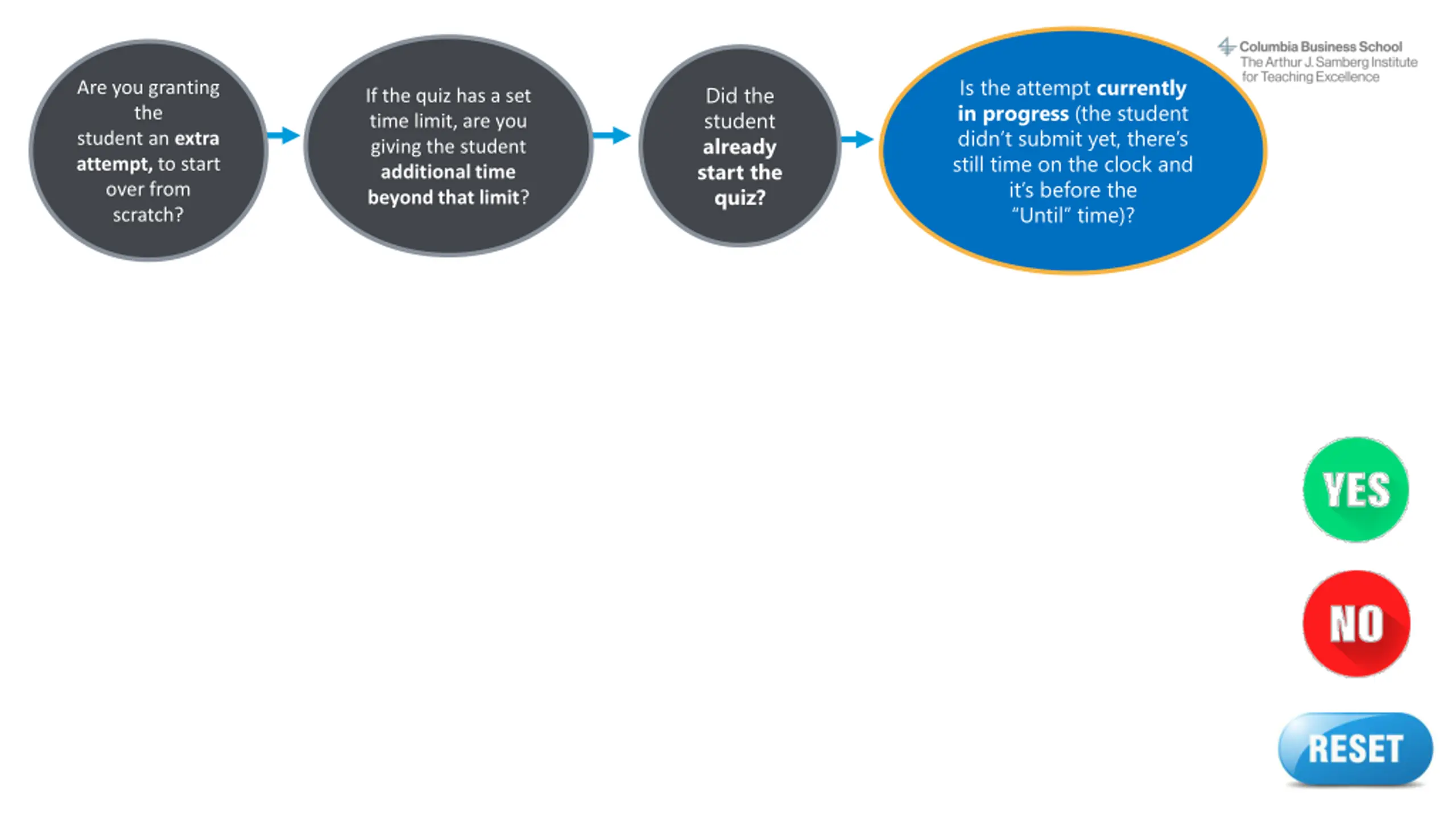Instructions This interactive decision tree helps CBS faculty and staff grant a student extra time or attempts on a Canvas quiz. In general, students should be able to complete a quiz within the designated time frame. However, on rare occasions a professor may allow a student additional time due to extenuating circumstances. The steps to do this vary by situation. To make the process easier, we've created this interactive tool to guide you through it quickly. This does not apply to students with ODS-approved accommodations (e.g., extended time) or makeup exams/reschedules. The program office (OSA/EMBA) handles accommodations and makeup exams. Refer to the MBA Exam Policy or EMBA Exam Policy and contact the program office with questions. How to use this decision tree: 1. Do not edit this slide deck. If you do, the built-in links may not work correctly. 2. Open this deck in Slide Show mode. 3. Go to the next slide after this one. 4. Answer the question by clicking on the YES or NO buttons. 5. Another question will appear. Continue answering each question (Yes or No) until you arrive at the answer, which describes the correct action steps to take for your situation. 6. At any time, you may click the RESET button to start over at the beginning. Or simply close the deck and reopen it in Slide Show mode. Email samberg@gsb.columbia.edu with questions or concerns about this tool. Find a text-only version here.