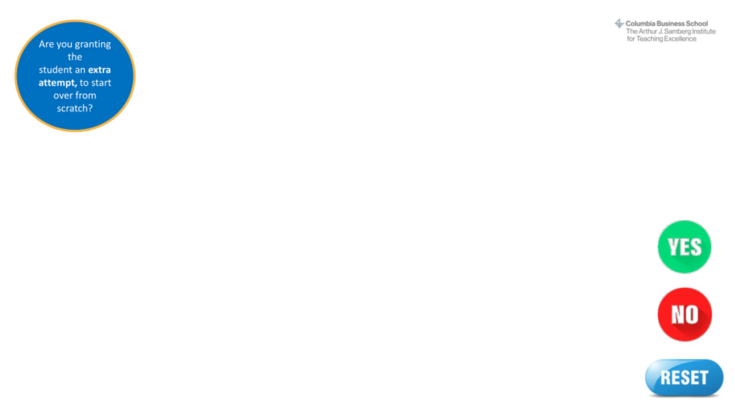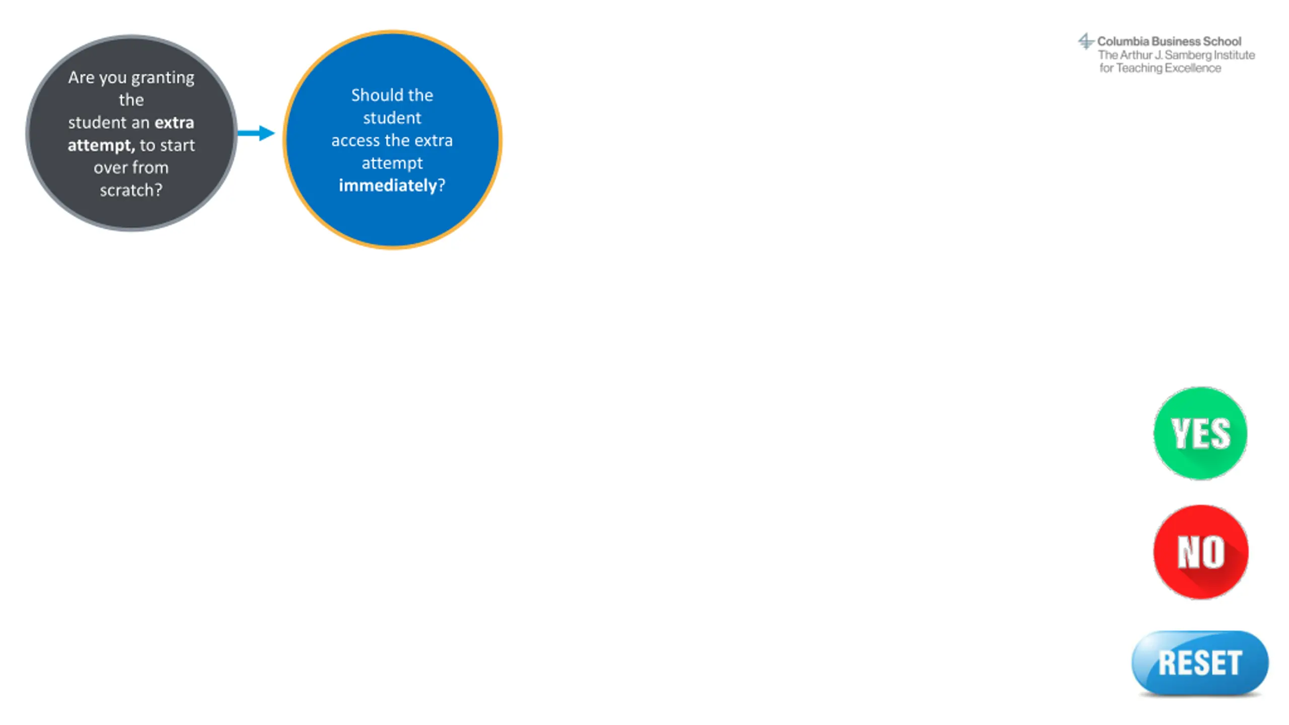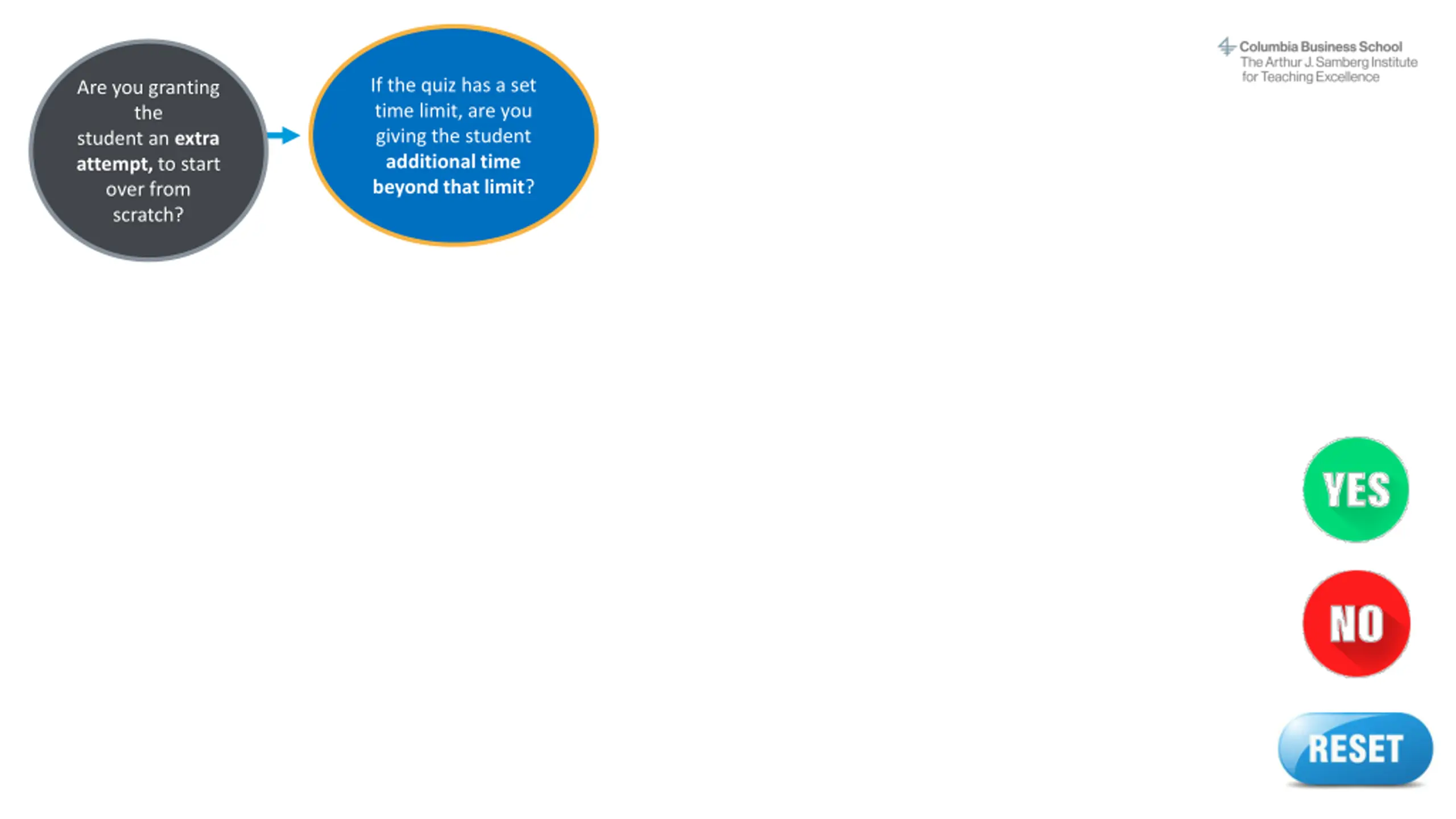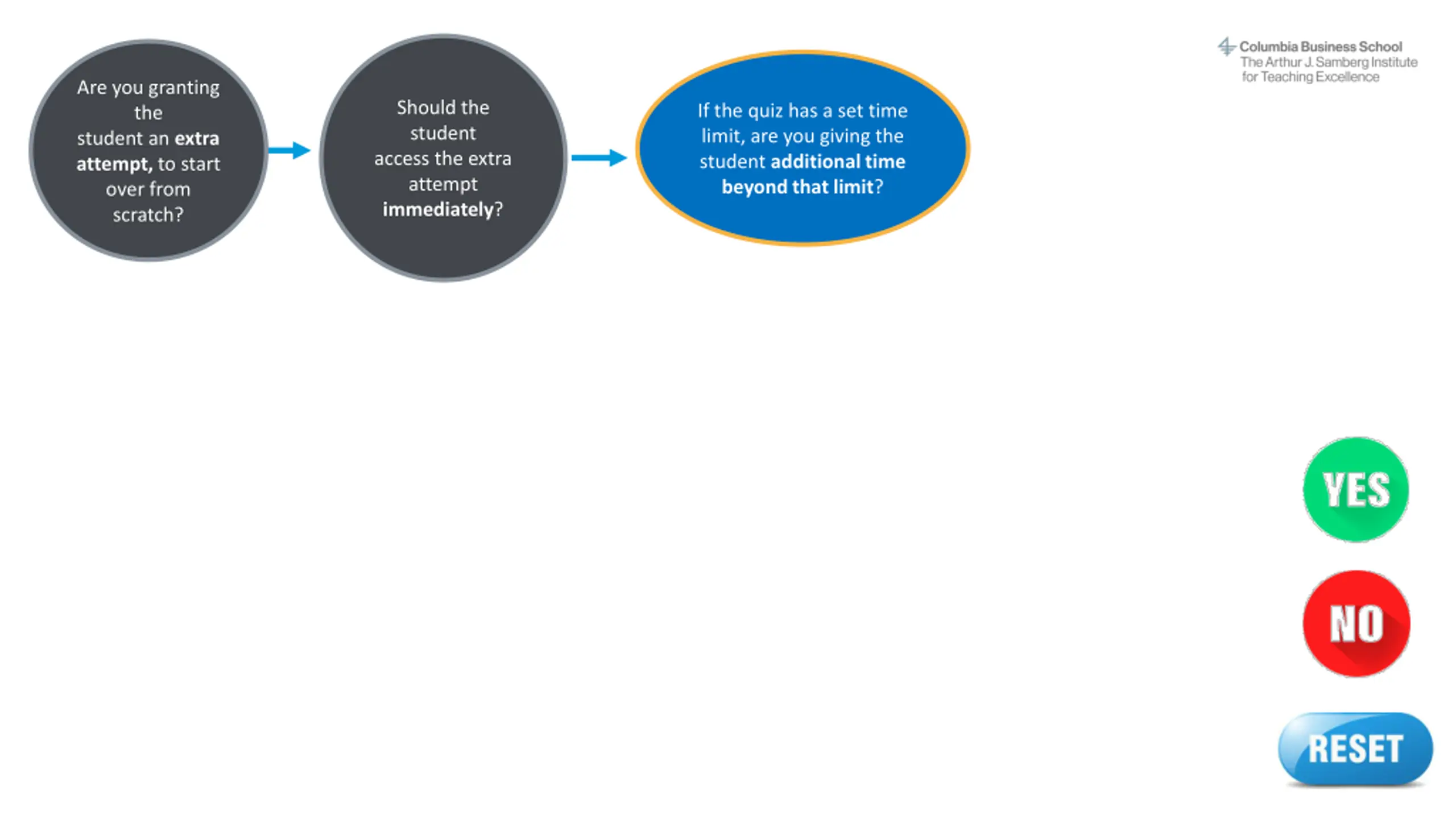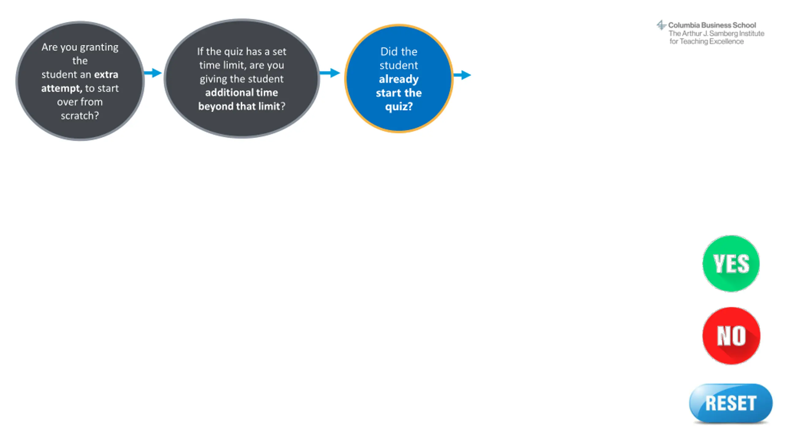 Instructions This interactive decision tree helps CBS faculty and staff grant a student extra time or attempts on a Canvas quiz. In general, students should be able to complete a quiz within the designated time frame. However, on rare occasions a professor may allow a student additional time due to extenuating circumstances. The steps to do this vary by situation. To make the process easier, we've created this interactive tool to guide you through it quickly. This does not apply to students with ODS-approved accommodations (e.g., extended time) or makeup exams/reschedules. The program office (OSA/EMBA) handles accommodations and makeup exams. Refer to the MBA Exam Policy or EMBA Exam Policy and contact the program office with questions. How to use this decision tree: 1. Do not edit this slide deck. If you do, the built-in links may not work correctly. 2. Open this deck in Slide Show mode. 3. Go to the next slide after this one. 4. Answer the question by clicking on the YES or NO buttons. 5. Another question will appear. Continue answering each question (Yes or No) until you arrive at the answer, which describes the correct action steps to take for your situation. 6. At any time, you may click the RESET button to start over at the beginning. Or simply close the deck and reopen it in Slide Show mode. Email samberg@gsb.columbia.edu with questions or concerns about this tool. Find a text-only version here.