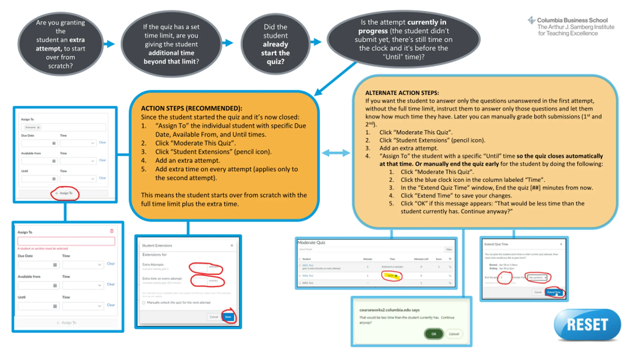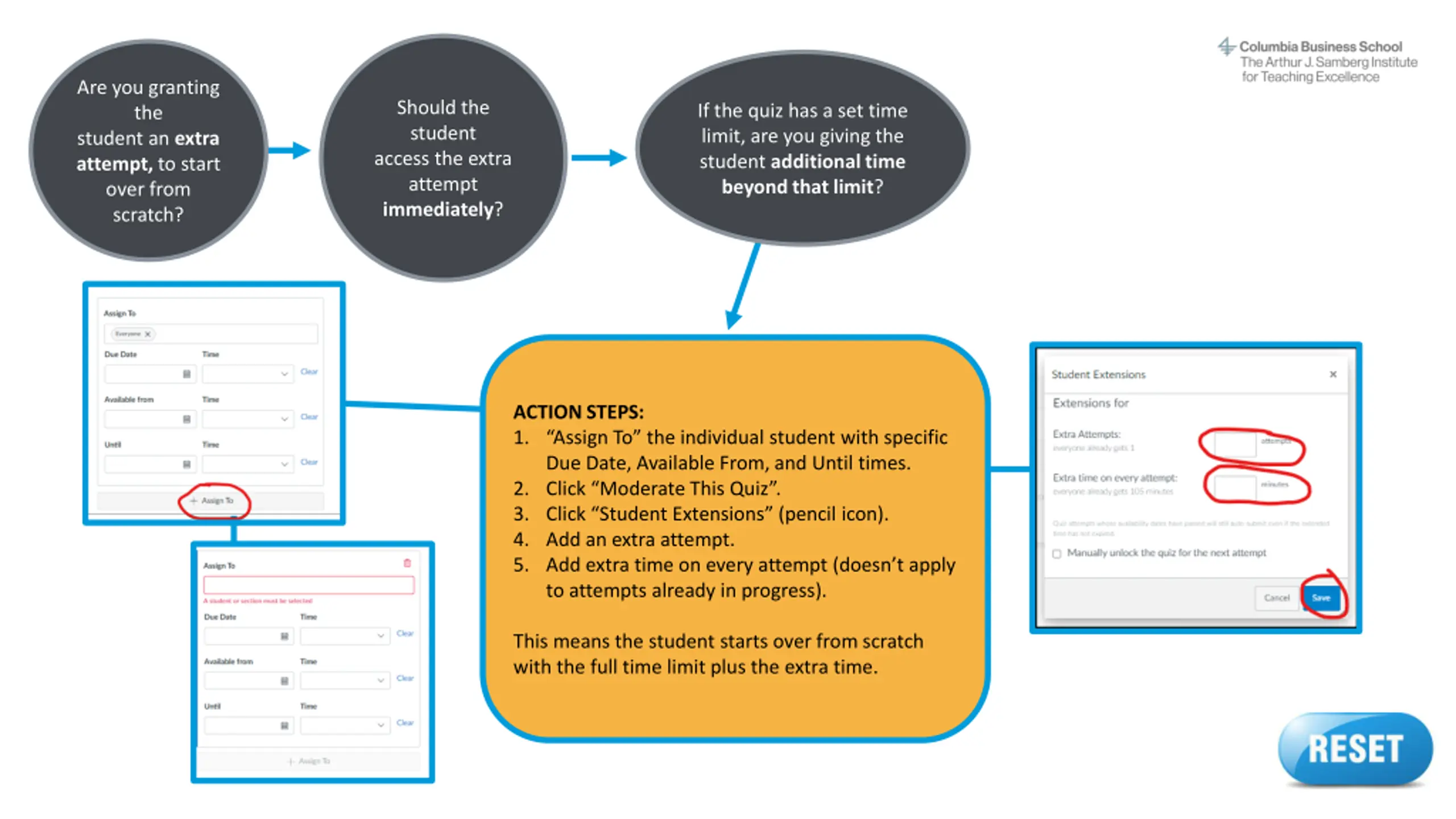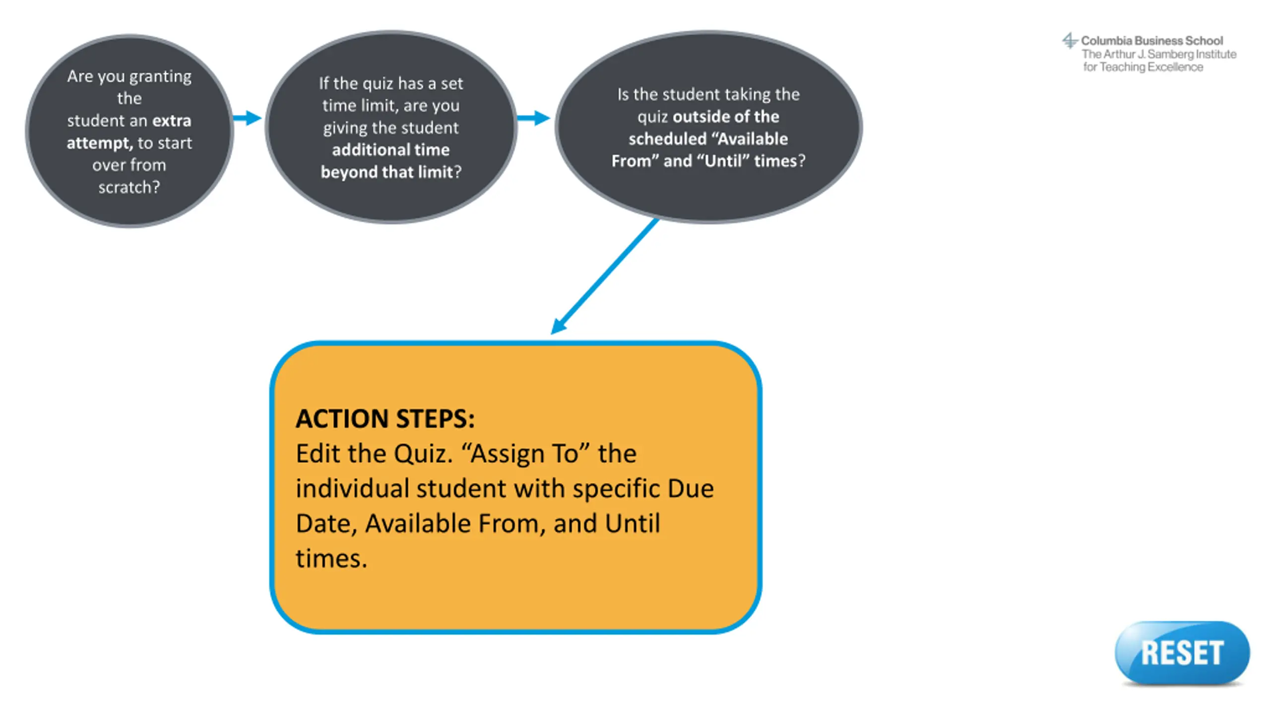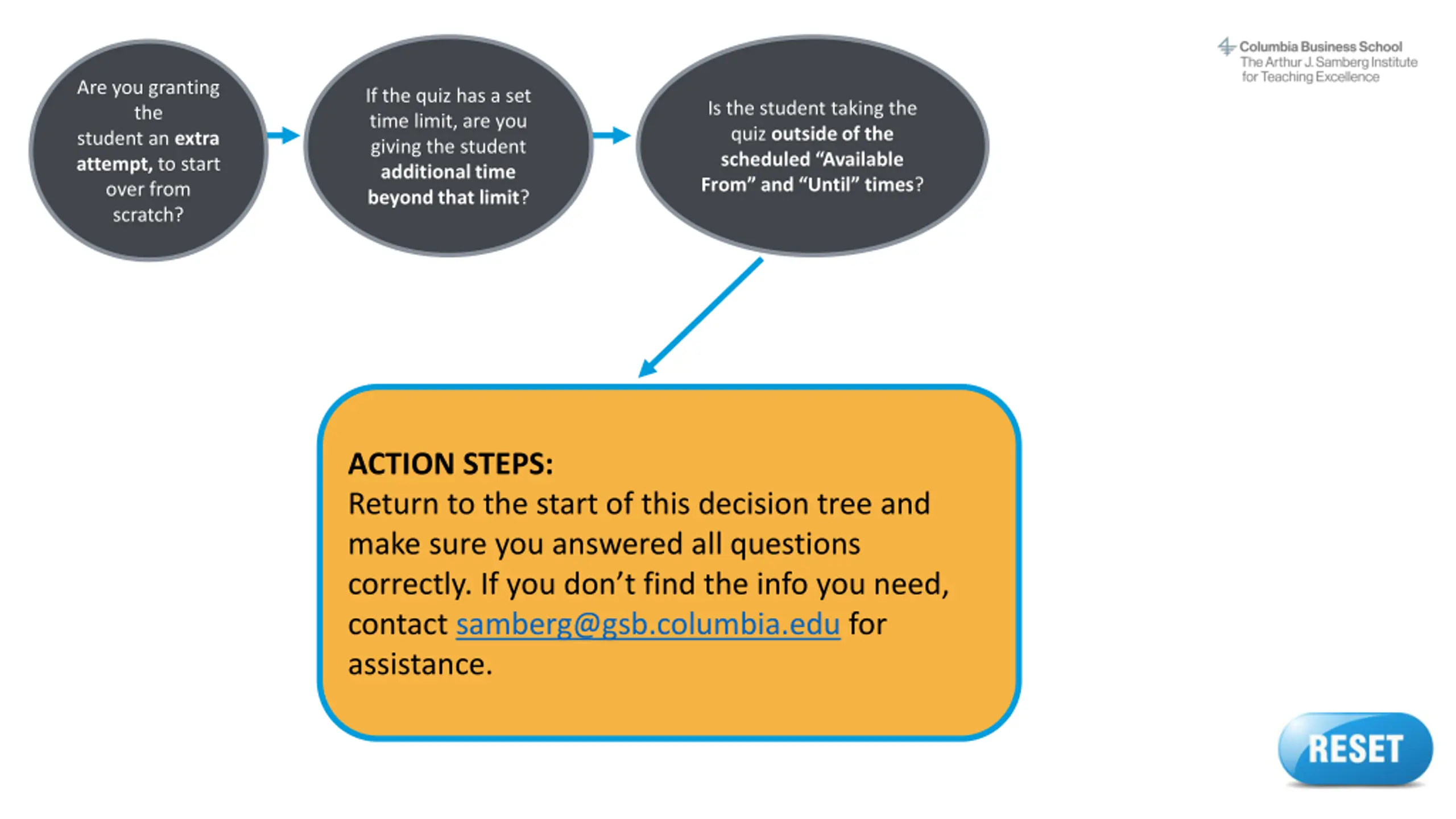Are you granting the student an extra attempt, to start over from scratch? If the quiz has a set time limit, are you giving the student additional time beyond that limit? Is the student taking the quiz outside of the scheduled Available From and Until times? ACTION STEPS: Return to the start of this decision tree and make sure you answered all questions correctly. If you don t find the info you need, contact samberg@gsb.columbia.edu for assistance. Reset button