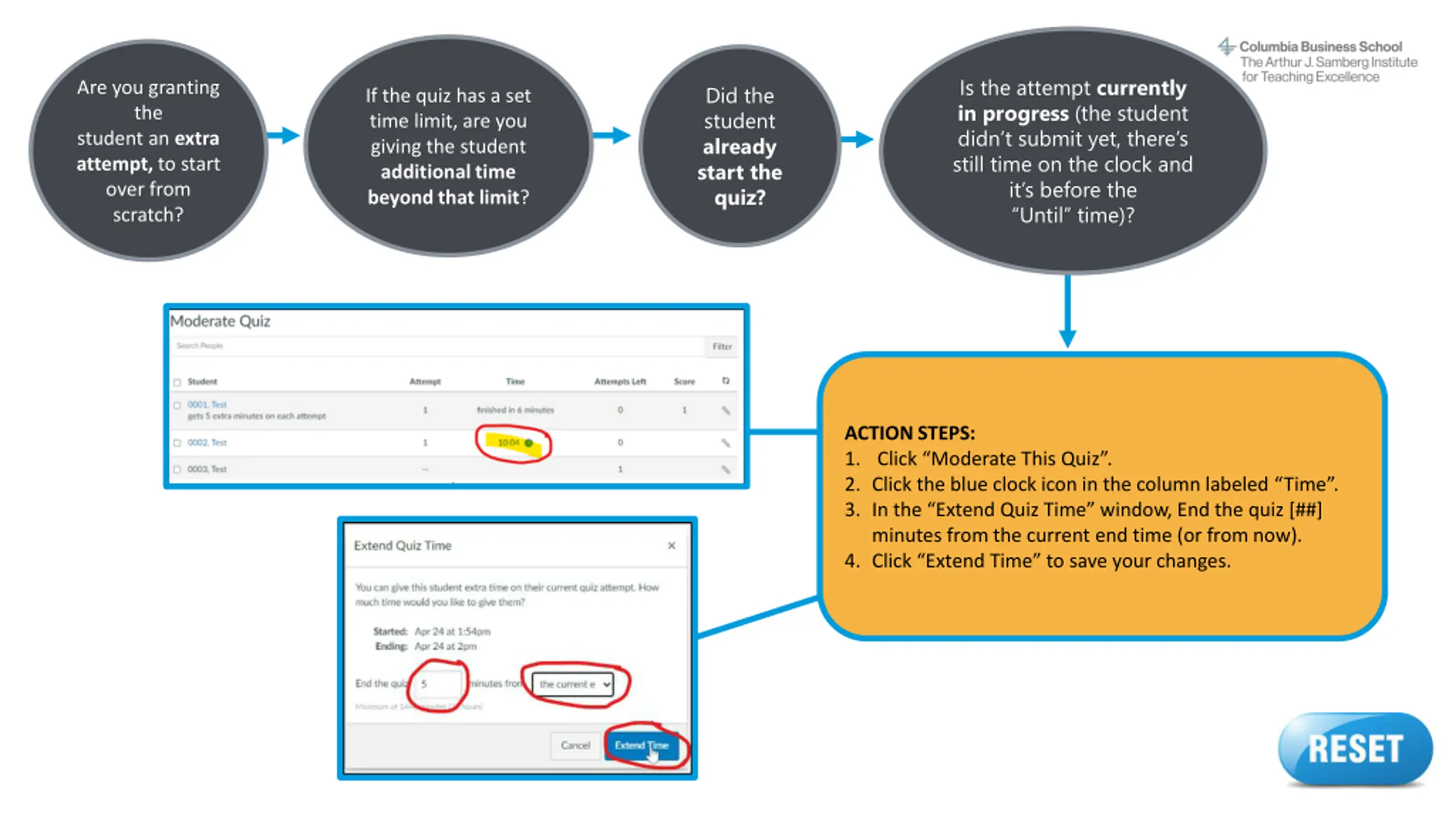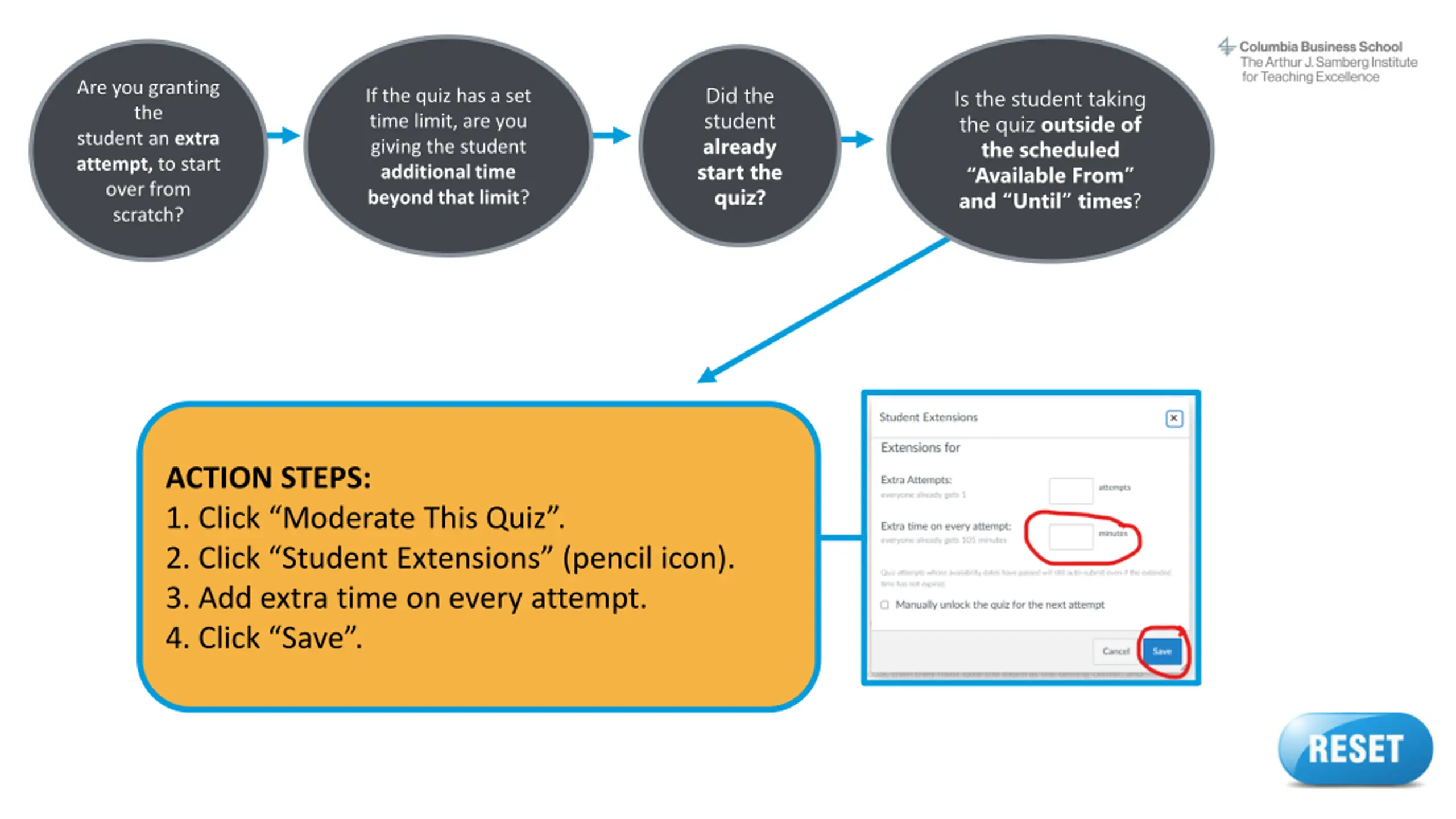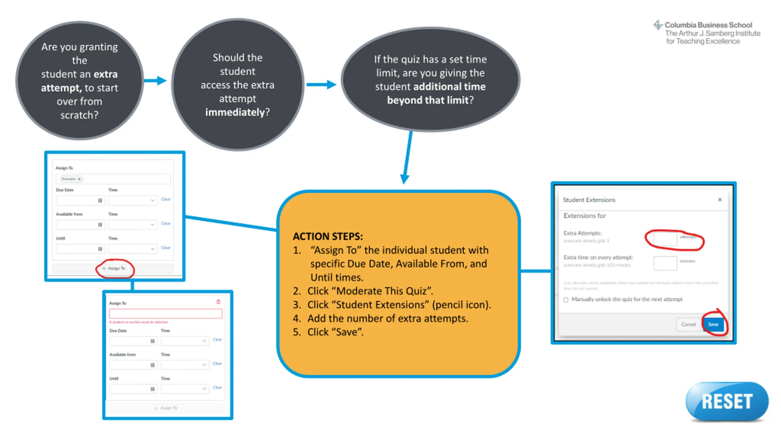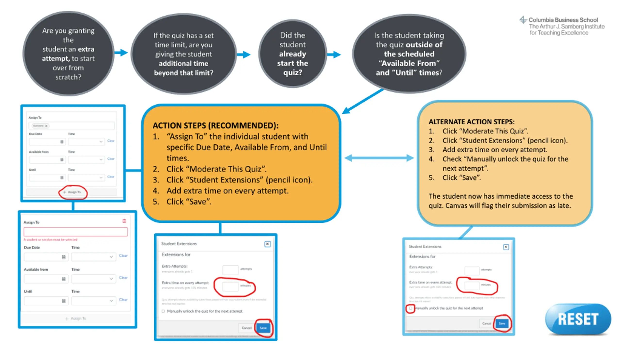 Are you granting the student an extra attempt, to start over from scratch? If the quiz has a set time limit, are you giving the student additional time beyond that limit? Is the student taking the quiz outside of the scheduled Available From and Until times? ACTION STEPS: Return to the start of this decision tree and make sure you answered all questions correctly. If you don t find the info you need, contact samberg@gsb.columbia.edu for assistance. Reset button