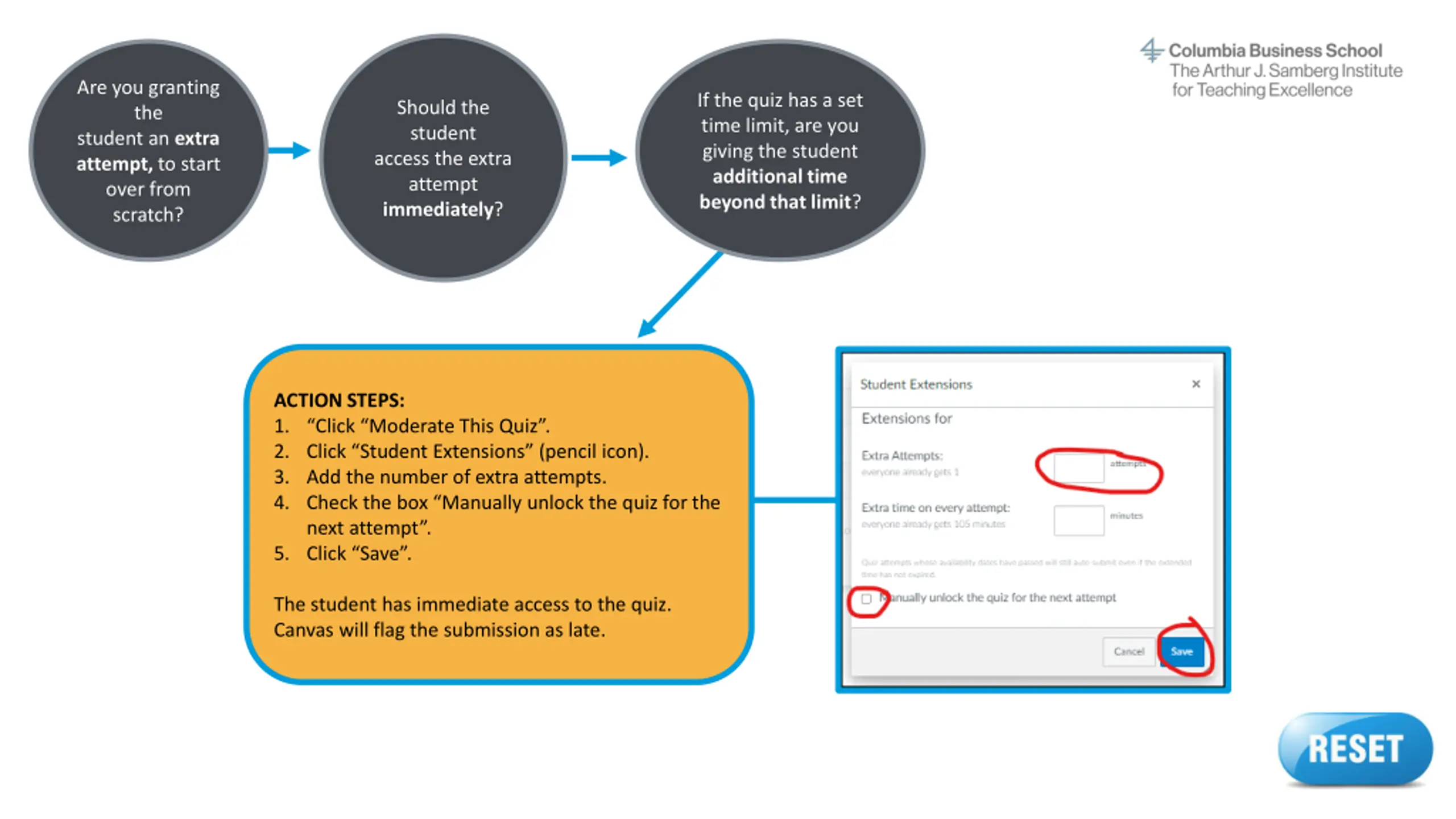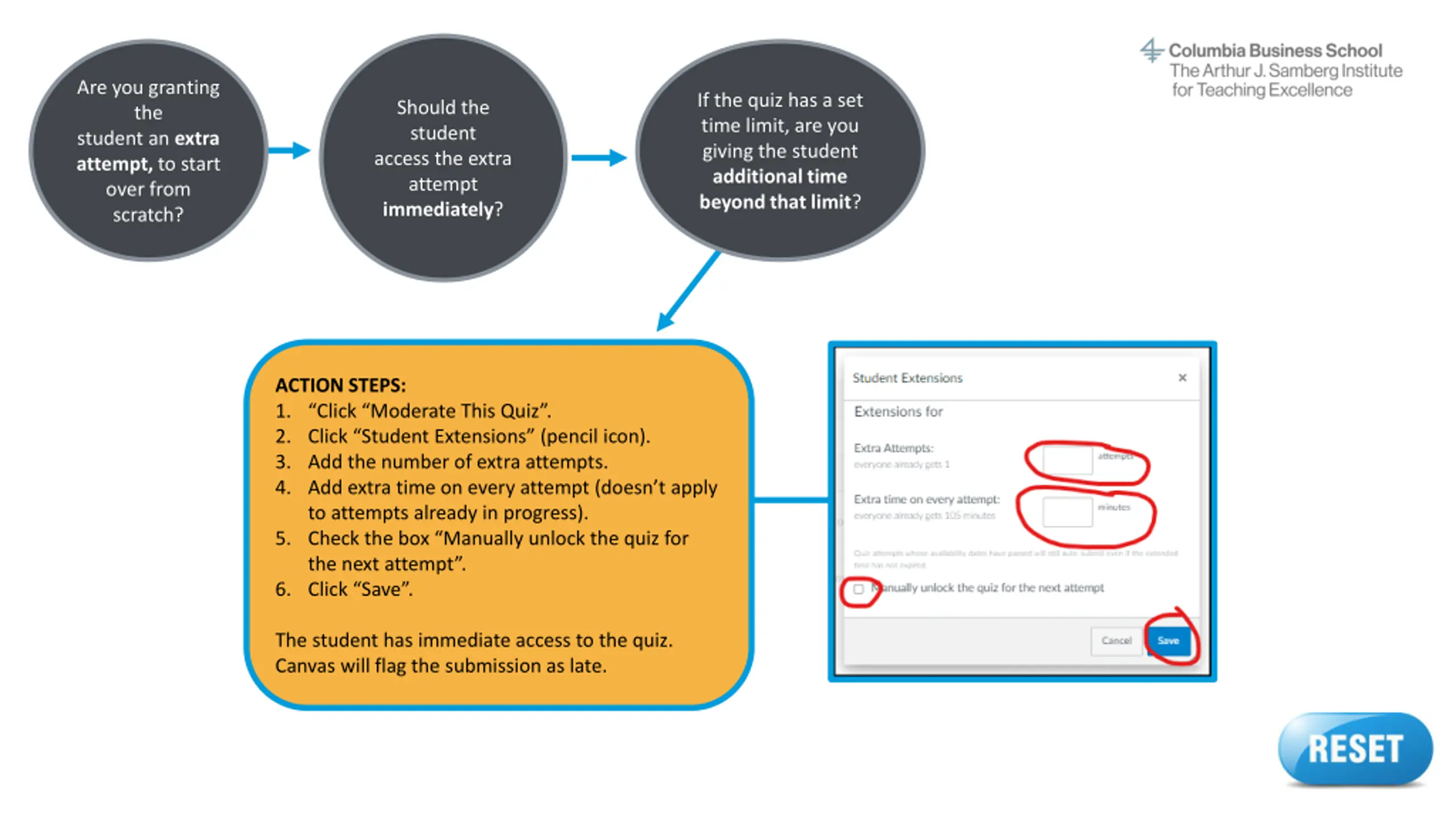 Are you granting the student an extra attempt, to start over from scratch? If the quiz has a set time limit, are you giving the student additional time beyond that limit? Should the student access the extra attempt immediately? ACTION STEPS: 1. Click Moderate This Quiz . 2. Click Student Extensions (pencil icon). 3. Add the number of extra attempts. 4. Add extra time on every attempt (doesn t apply to attempts already in progress). 5. Check the box Manually unlock the quiz for the next attempt . 6. Click Save . The student has immediate access to the quiz. Canvas will flag the submission as late. Reset button