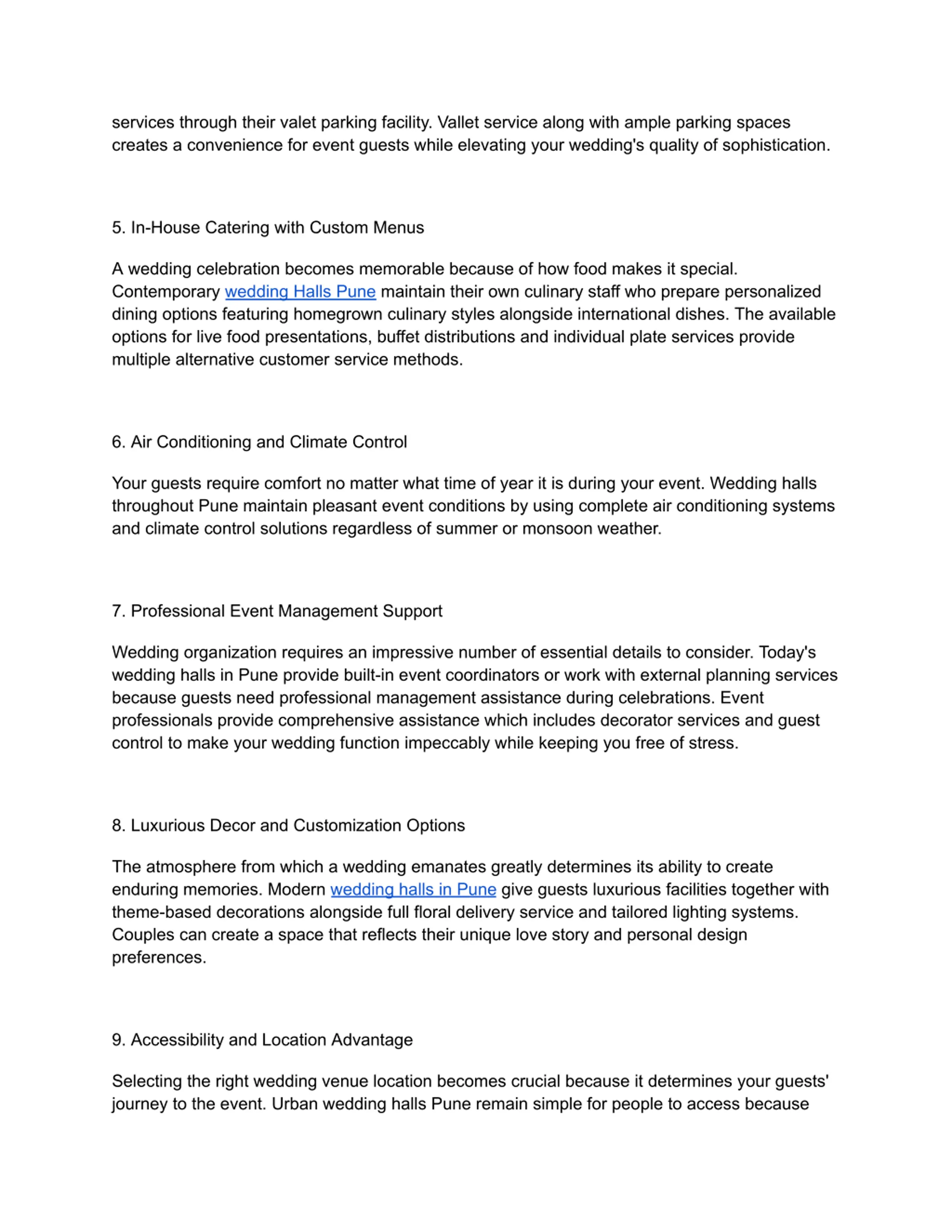 services through their valet parking facility. Vallet service along with ample parking spaces creates a convenience for event guests while elevating your wedding's quality of sophistication. 5. In-House Catering with Custom Menus A wedding celebration becomes memorable because of how food makes it special. Contemporary wedding Halls Pune maintain their own culinary staff who prepare personalized dining options featuring homegrown culinary styles alongside international dishes. The available options for live food presentations, buffet distributions and individual plate services provide multiple alternative customer service methods. 6. Air Conditioning and Climate Control Your guests require comfort no matter what time of year it is during your event. Wedding halls throughout Pune maintain pleasant event conditions by using complete air conditioning systems and climate control solutions regardless of summer or monsoon weather. 7. Professional Event Management Support Wedding organization requires an impressive number of essential details to consider. Today's wedding halls in Pune provide built-in event coordinators or work with external planning services because guests need professional management assistance during celebrations. Event professionals provide comprehensive assistance which includes decorator services and guest control to make your wedding function impeccably while keeping you free of stress. 8. Luxurious Decor and Customization Options The atmosphere from which a wedding emanates greatly determines its ability to create enduring memories. Modern wedding halls in Pune give guests luxurious facilities together with theme-based decorations alongside full floral delivery service and tailored lighting systems. Couples can create a space that reflects their unique love story and personal design preferences. 9. Accessibility and Location Advantage Selecting the right wedding venue location becomes crucial because it determines your guests' journey to the event. Urban wedding halls Pune remain simple for people to access because