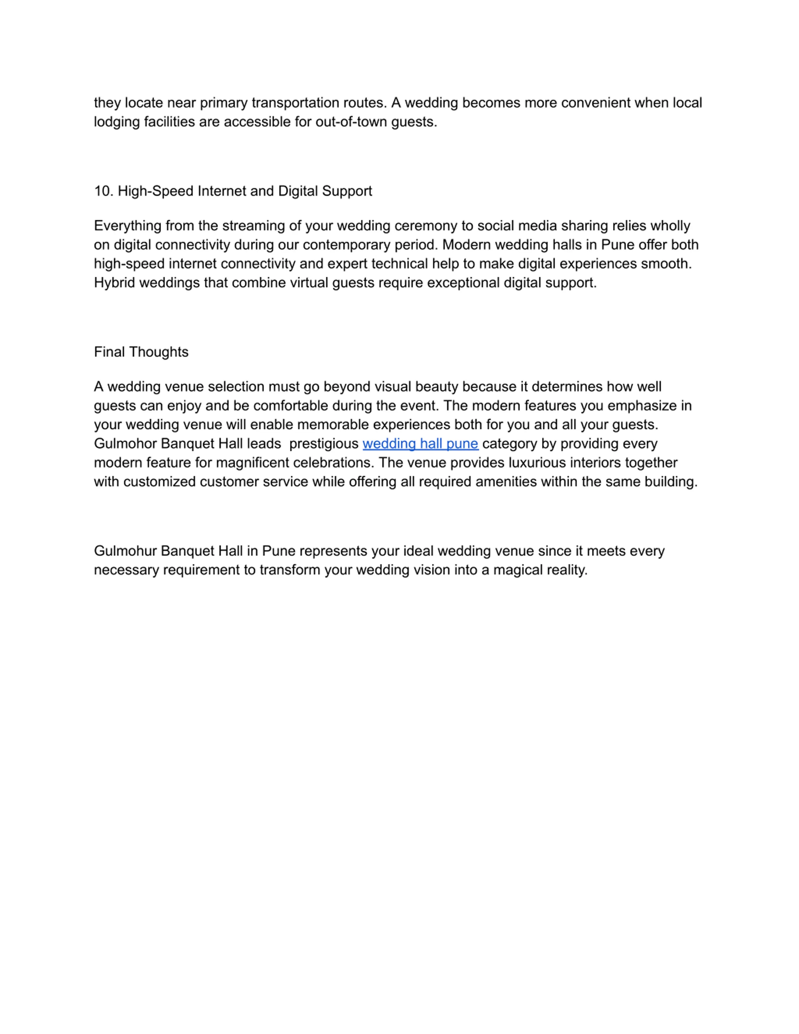 they locate near primary transportation routes. A wedding becomes more convenient when local lodging facilities are accessible for out-of-town guests. 10. High-Speed Internet and Digital Support Everything from the streaming of your wedding ceremony to social media sharing relies wholly on digital connectivity during our contemporary period. Modern wedding halls in Pune offer both high-speed internet connectivity and expert technical help to make digital experiences smooth. Hybrid weddings that combine virtual guests require exceptional digital support. Final Thoughts A wedding venue selection must go beyond visual beauty because it determines how well guests can enjoy and be comfortable during the event. The modern features you emphasize in your wedding venue will enable memorable experiences both for you and all your guests. Gulmohor Banquet Hall leads prestigious wedding hall pune category by providing every modern feature for magnificent celebrations. The venue provides luxurious interiors together with customized customer service while offering all required amenities within the same building. Gulmohur Banquet Hall in Pune represents your ideal wedding venue since it meets every necessary requirement to transform your wedding vision into a magical reality.