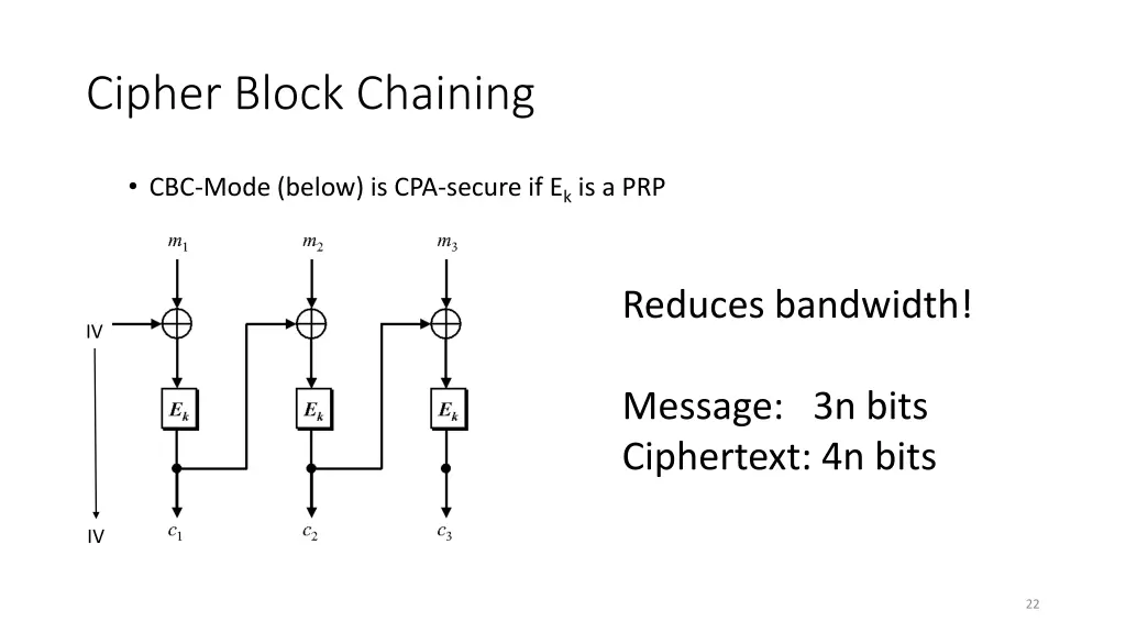 Cipher Block Chaining CBC-Mode (below) is CPA-secure if Ek is a PRP Reduces bandwidth! IV Message: 3n bits Ciphertext: 4n bits IV 22