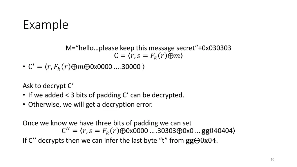 Example M= hello please keep this message secret +0x030303 C = ?,? = ??? ? C = ?,??? ? 0x0000 .30000 Ask to decrypt C If we added < 3 bits of padding C can be decrypted. Otherwise, we will get a decryption error. Once we know we have three bits of padding we can set C = ?,? = ??? 0x0000 .30303 0x0 ??040404 If C decrypts then we can infer the last byte t from ?? 0x04. 10