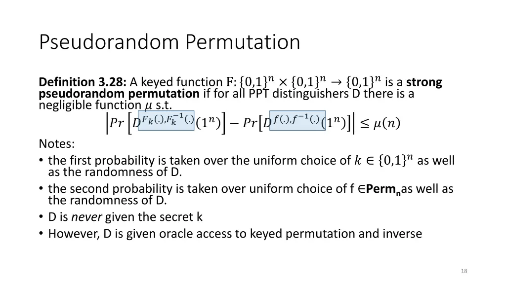 Pseudorandom Permutation A keyed function F: 0,1? 0,1? 0,1?, which is invertible and looks random without the secret key k. Similar to a PRF, but Computing Fk(x) and ?? 1? is efficient (polynomial-time) Definition 3.28: A keyed function F: 0,1? 0,1? 0,1? is a strong pseudorandom permutation if for all PPT distinguishers D there is a negligible function ? s.t. ?? ???. ,?? ?? ?? . ,? 1.1? 1.1? ? ? 17