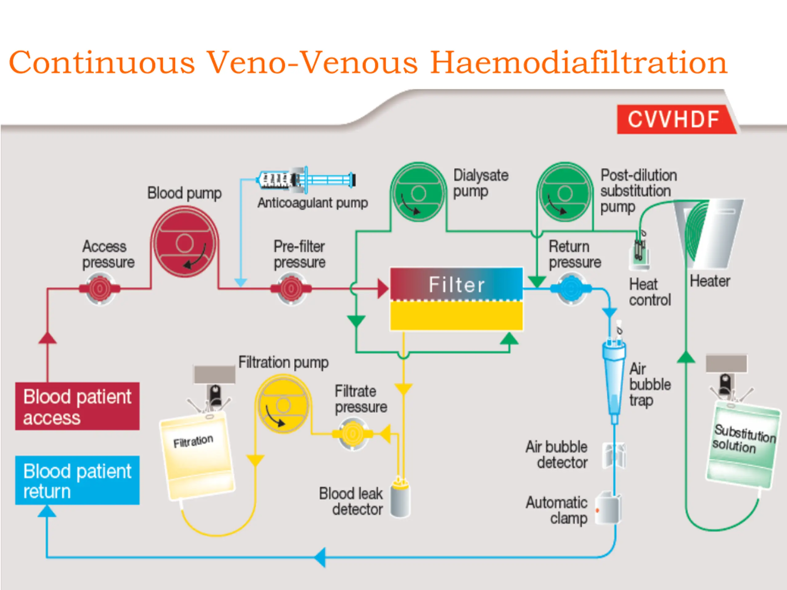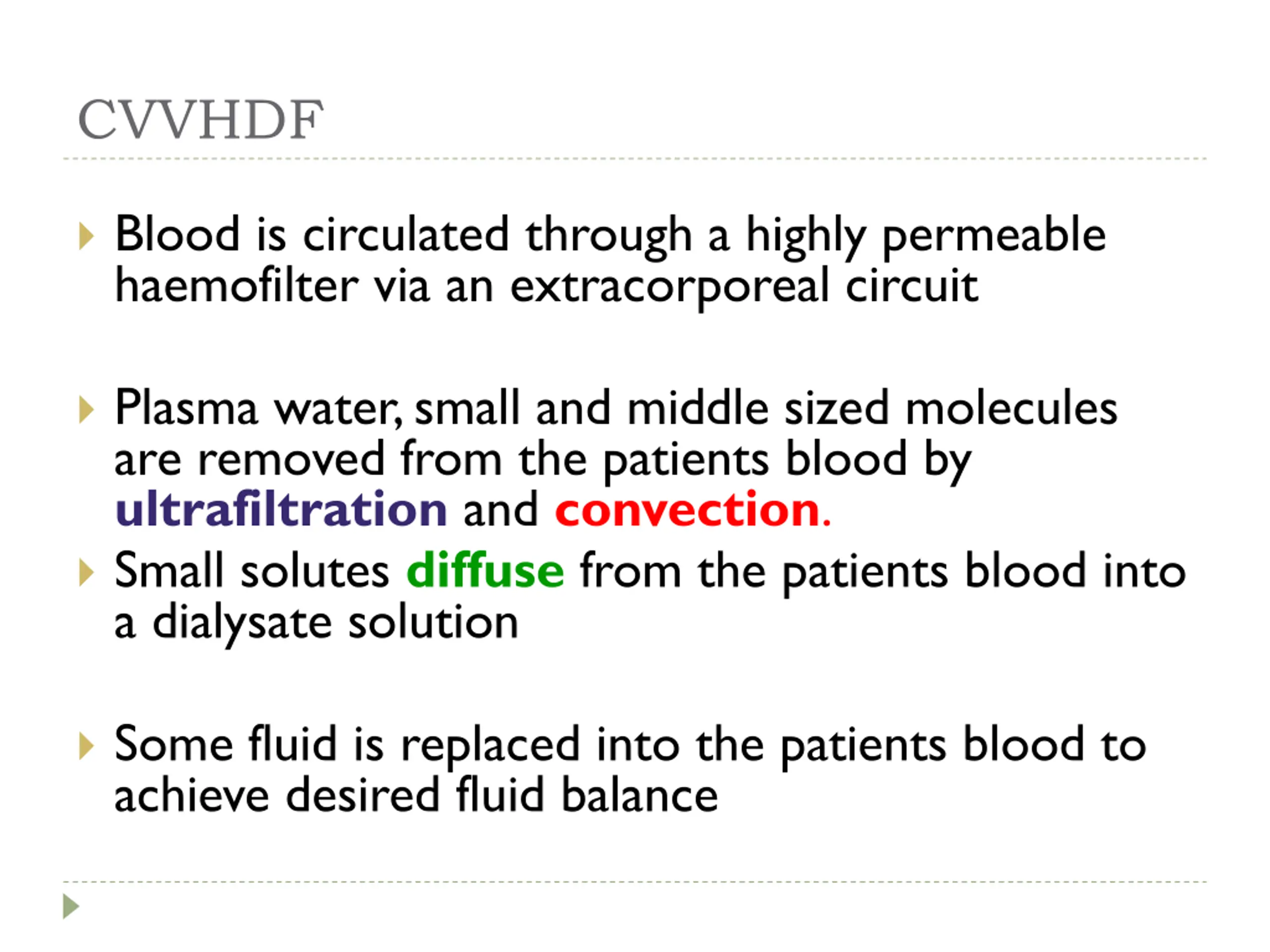 CVVHDF Blood is circulated through a highly permeable haemofilter via an extracorporeal circuit Plasma water, small and middle sized molecules are removed from the patients blood by ultrafiltration and convection. Small solutes diffuse from the patients blood into a dialysate solution Some fluid is replaced into the patients blood to achieve desired fluid balance