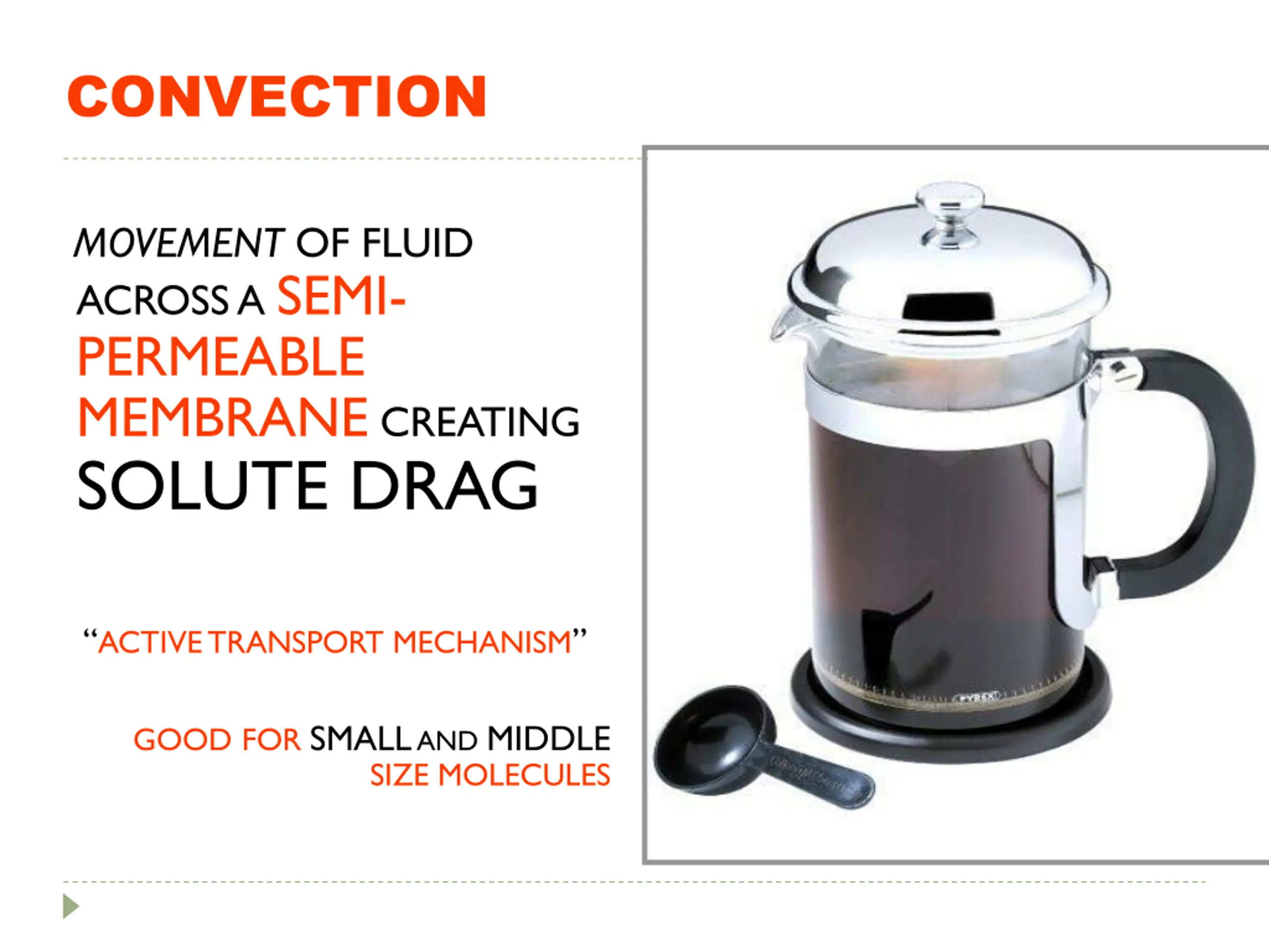 CONVECTION MOVEMENT OF FLUID ACROSS A SEMI- PERMEABLE MEMBRANE CREATING SOLUTE DRAG ACTIVE TRANSPORT MECHANISM GOOD FORSMALL AND MIDDLE SIZE MOLECULES