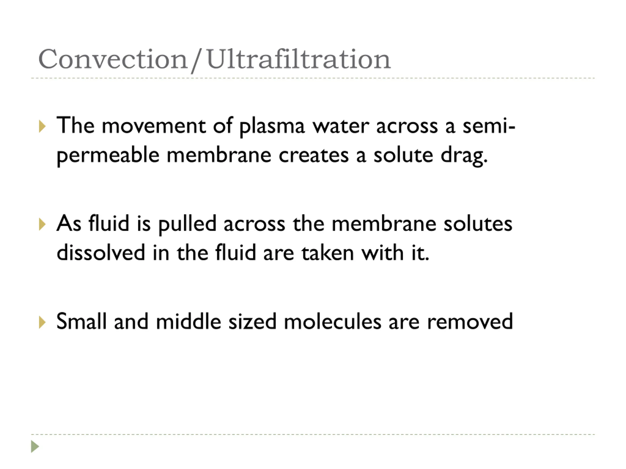 Convection/Ultrafiltration The movement of plasma water across a semi- permeable membrane creates a solute drag. As fluid is pulled across the membrane solutes dissolved in the fluid are taken with it. Small and middle sized molecules are removed