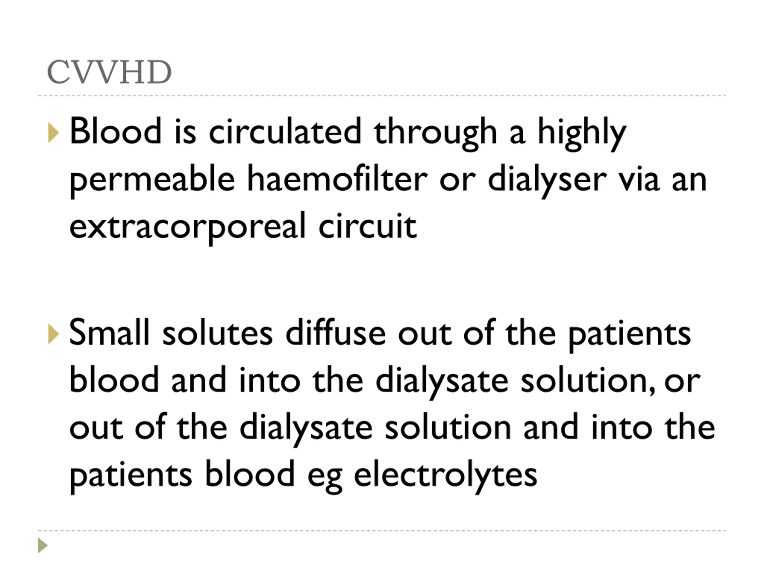 CVVHD Blood is circulated through a highly permeable haemofilter or dialyser via an extracorporeal circuit Small solutes diffuse out of the patients blood and into the dialysate solution, or out of the dialysate solution and into the patients blood eg electrolytes