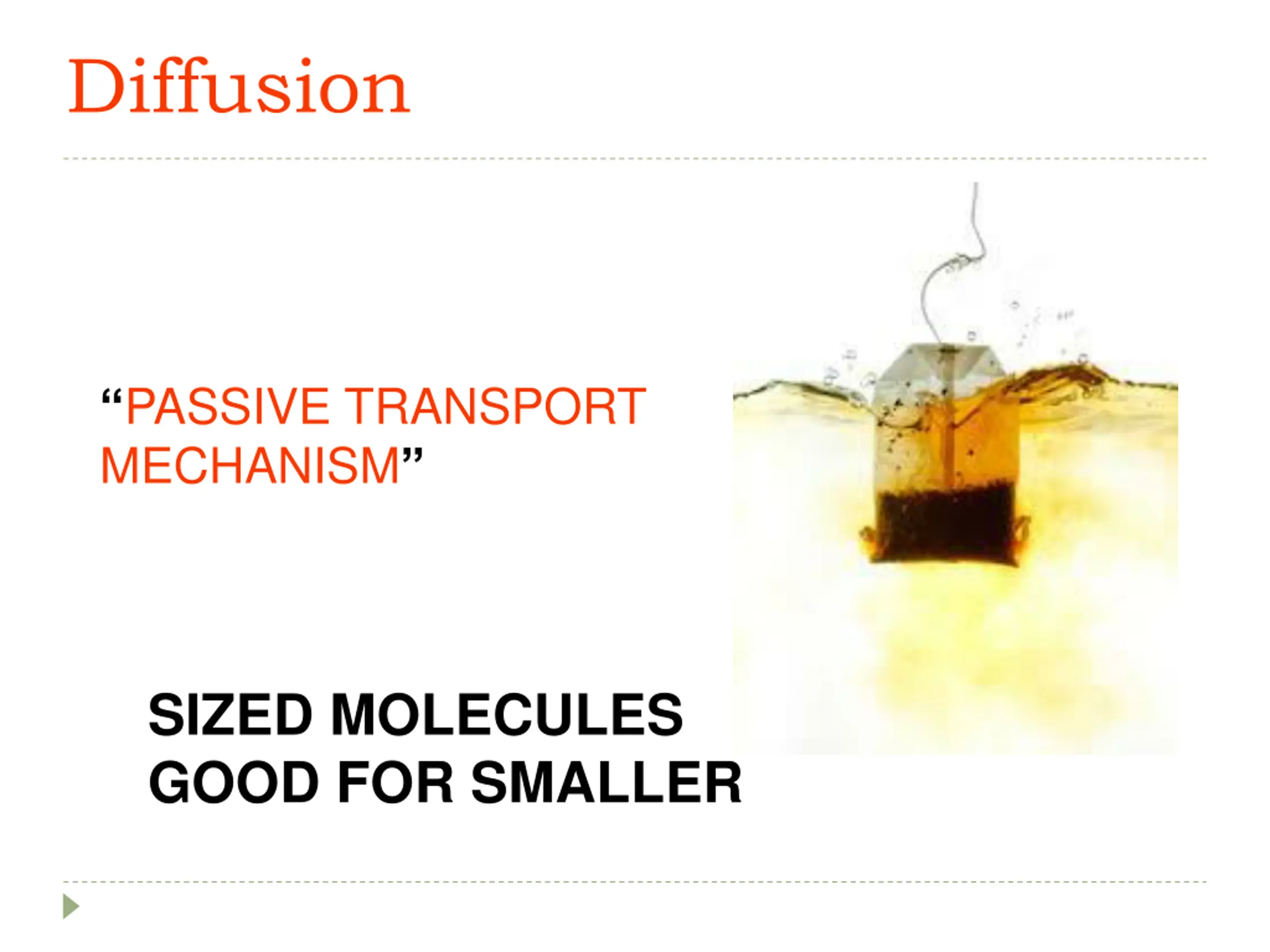 Diffusion PASSIVE TRANSPORT MECHANISM SIZED MOLECULES GOOD FOR SMALLER