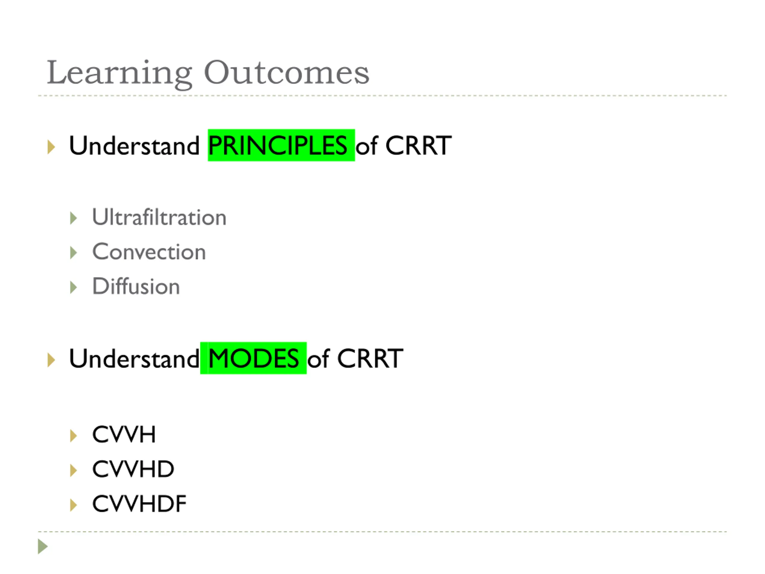 Learning Outcomes Understand PRINCIPLES of CRRT Ultrafiltration Convection Diffusion Understand MODES of CRRT CVVH CVVHD CVVHDF