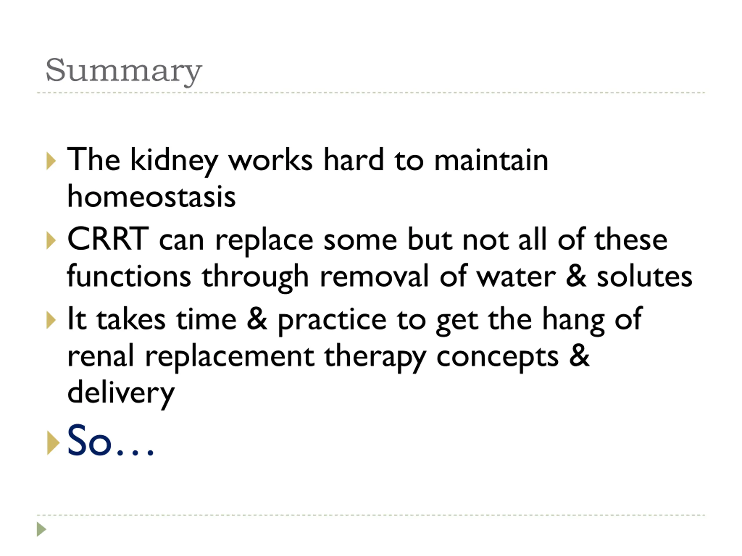 Summary The kidney works hard to maintain homeostasis CRRT can replace some but not all of these functions through removal of water & solutes It takes time & practice to get the hang of renal replacement therapy concepts & delivery So