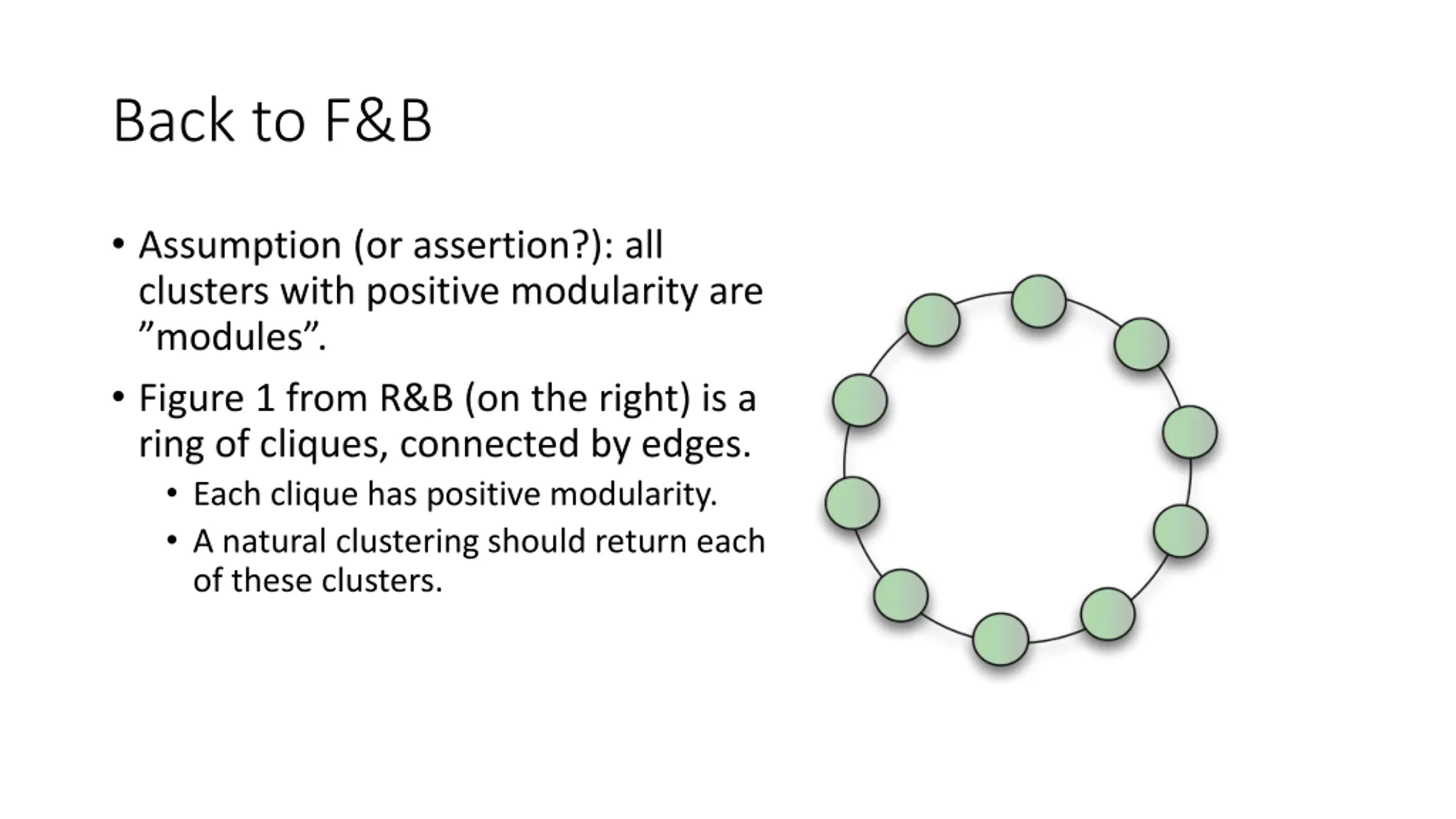 Back to F&B Assumption (or assertion?): all clusters with positive modularity are modules . Figure 1 from R&B (on the right) is a ring of cliques, connected by edges. Each clique has positive modularity. A natural clustering should return each of these clusters.